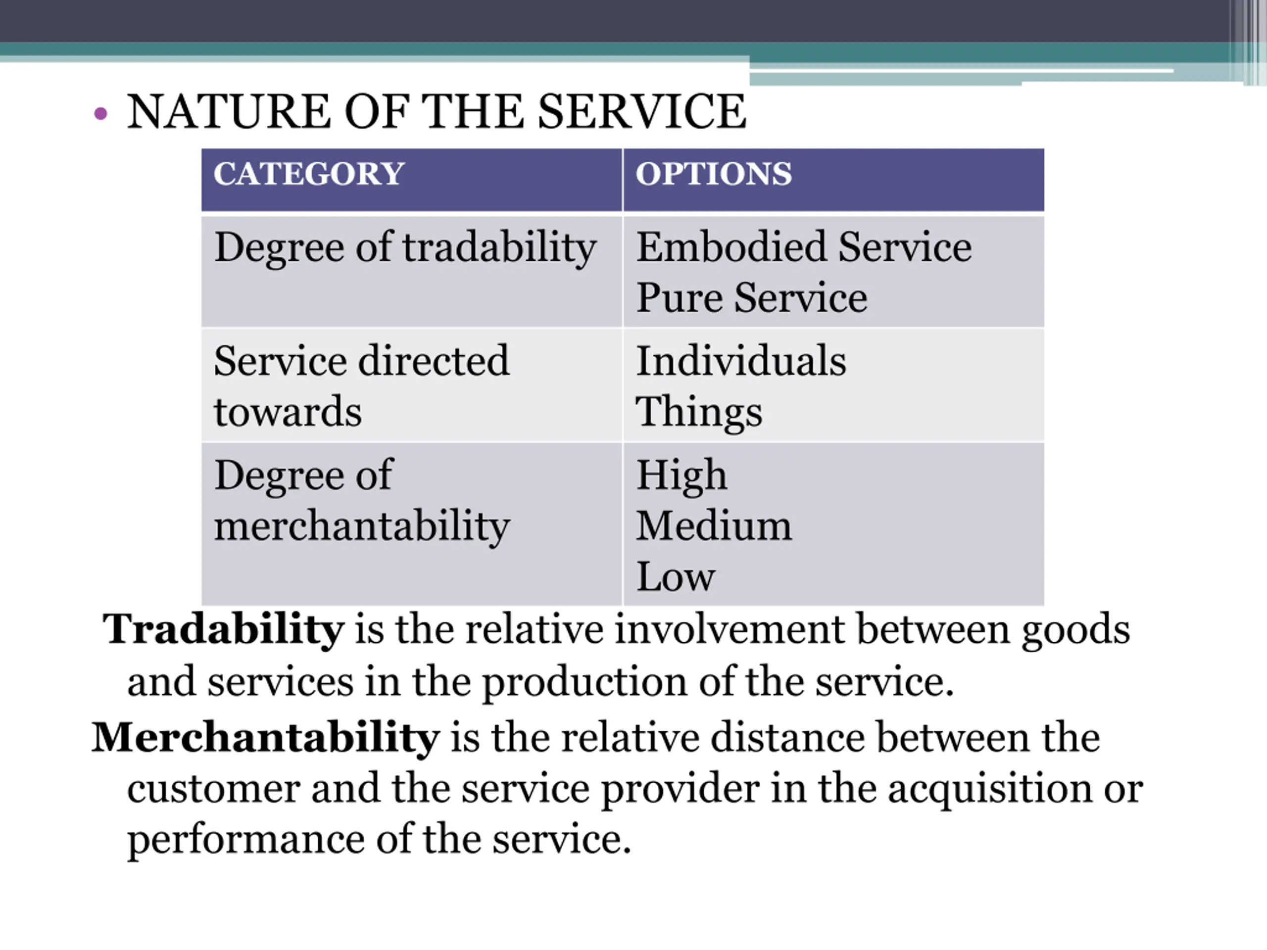 NATURE OF THE SERVICE CATEGORY OPTIONS Degree of tradability Embodied Service Pure Service Individuals Things High Medium Low Service directed towards Degree of merchantability Tradability is the relative involvement between goods and services in the production of the service. Merchantability is the relative distance between the customer and the service provider in the acquisition or performance of the service.