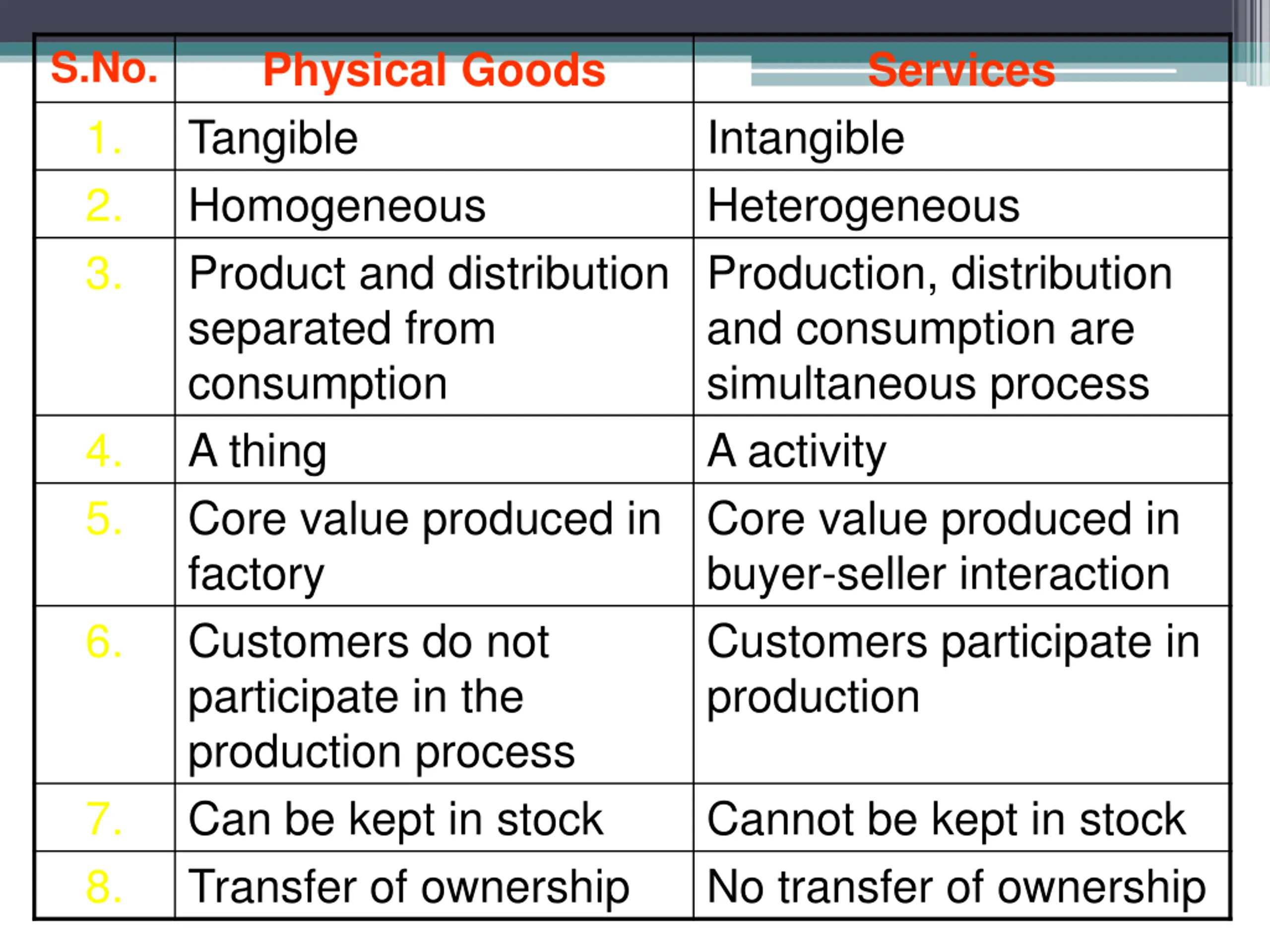 Physical Goods Tangible Homogeneous Product and distribution separated from consumption A thing Core value produced in factory Customers do not participate in the production process Can be kept in stock Transfer of ownership Services S.No. 1. 2. 3. Intangible Heterogeneous Production, distribution and consumption are simultaneous process A activity Core value produced in buyer-seller interaction Customers participate in production 4. 5. 6. 7. 8. Cannot be kept in stock No transfer of ownership