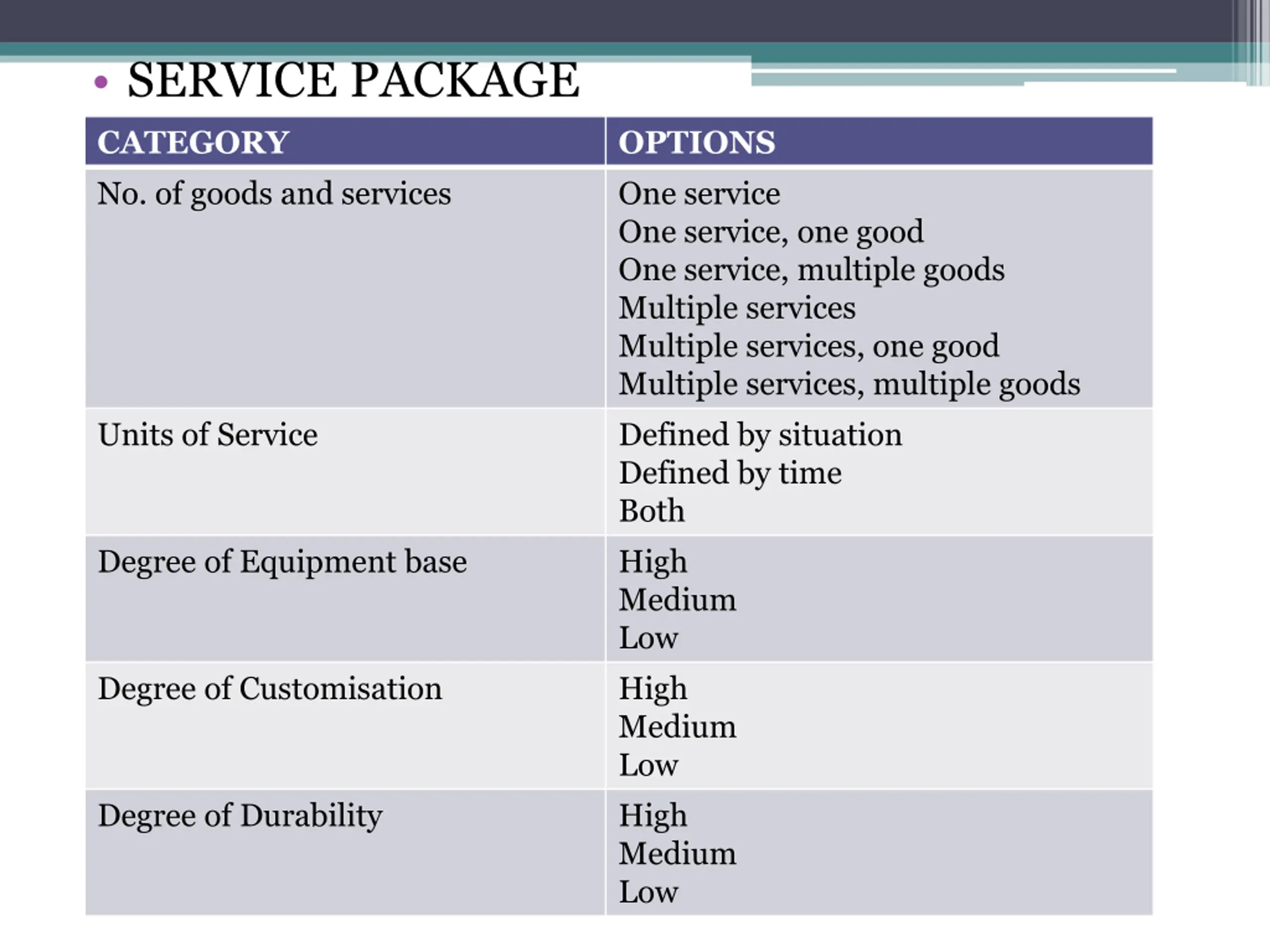 SERVICE PACKAGE CATEGORY No. of goods and services OPTIONS One service One service, one good One service, multiple goods Multiple services Multiple services, one good Multiple services, multiple goods Defined by situation Defined by time Both High Medium Low High Medium Low High Medium Low Units of Service Degree of Equipment base Degree of Customisation Degree of Durability