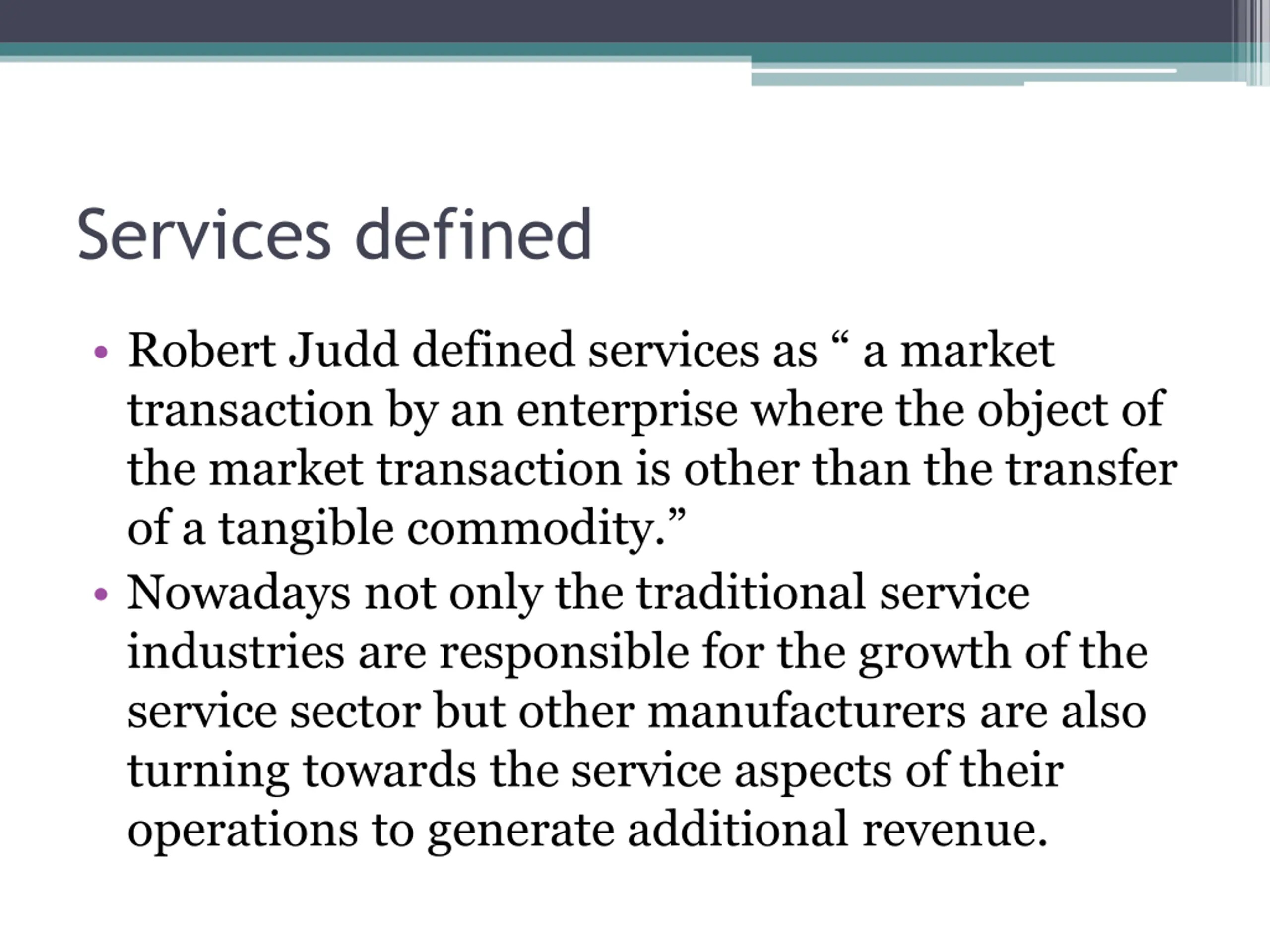 Services defined Robert Judd defined services as a market transaction by an enterprise where the object of the market transaction is other than the transfer of a tangible commodity. Nowadays not only the traditional service industries are responsible for the growth of the service sector but other manufacturers are also turning towards the service aspects of their operations to generate additional revenue.