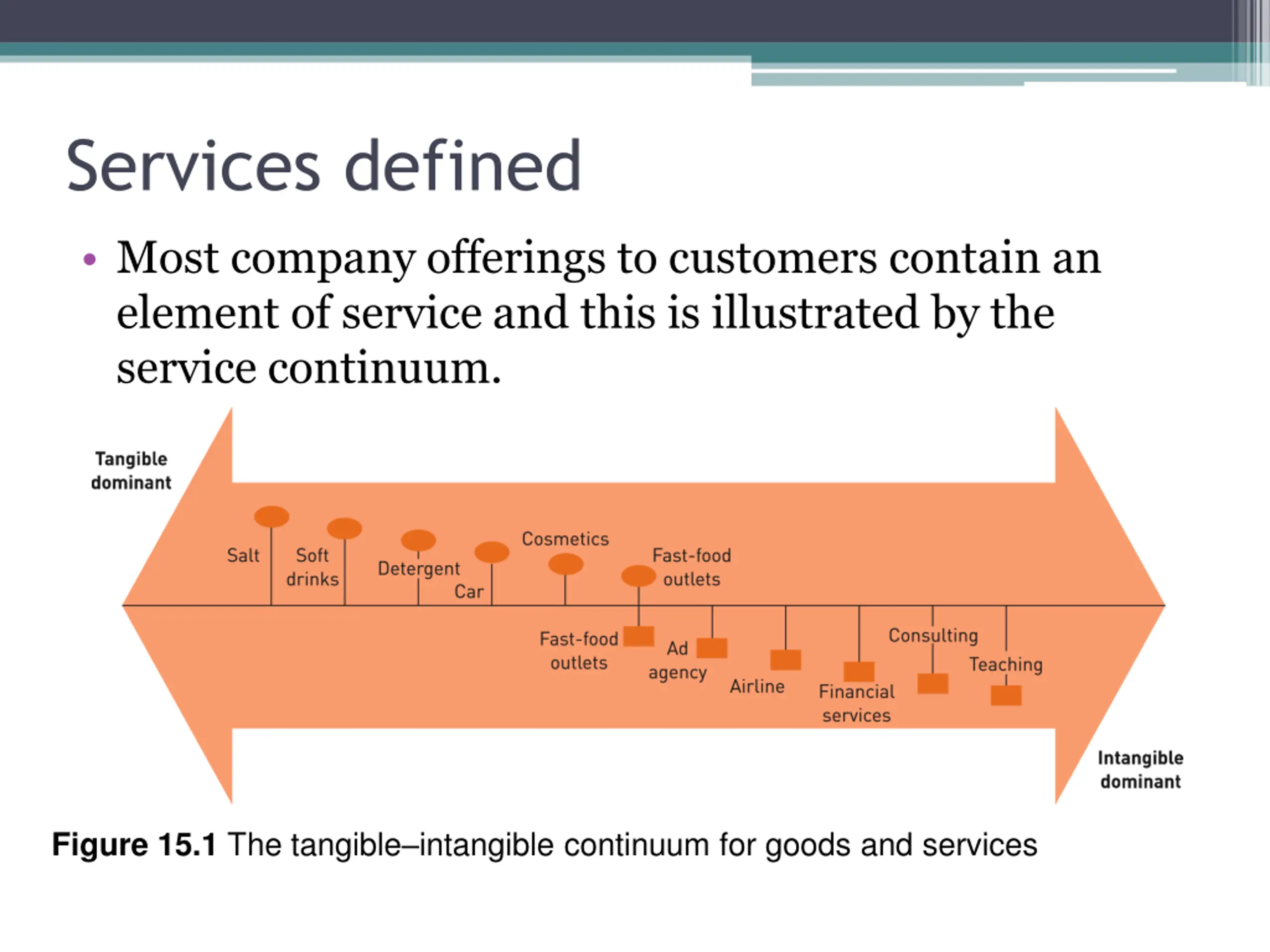 Services defined Most company offerings to customers contain an element of service and this is illustrated by the service continuum. Figure 15.1 The tangible intangible continuum for goods and services