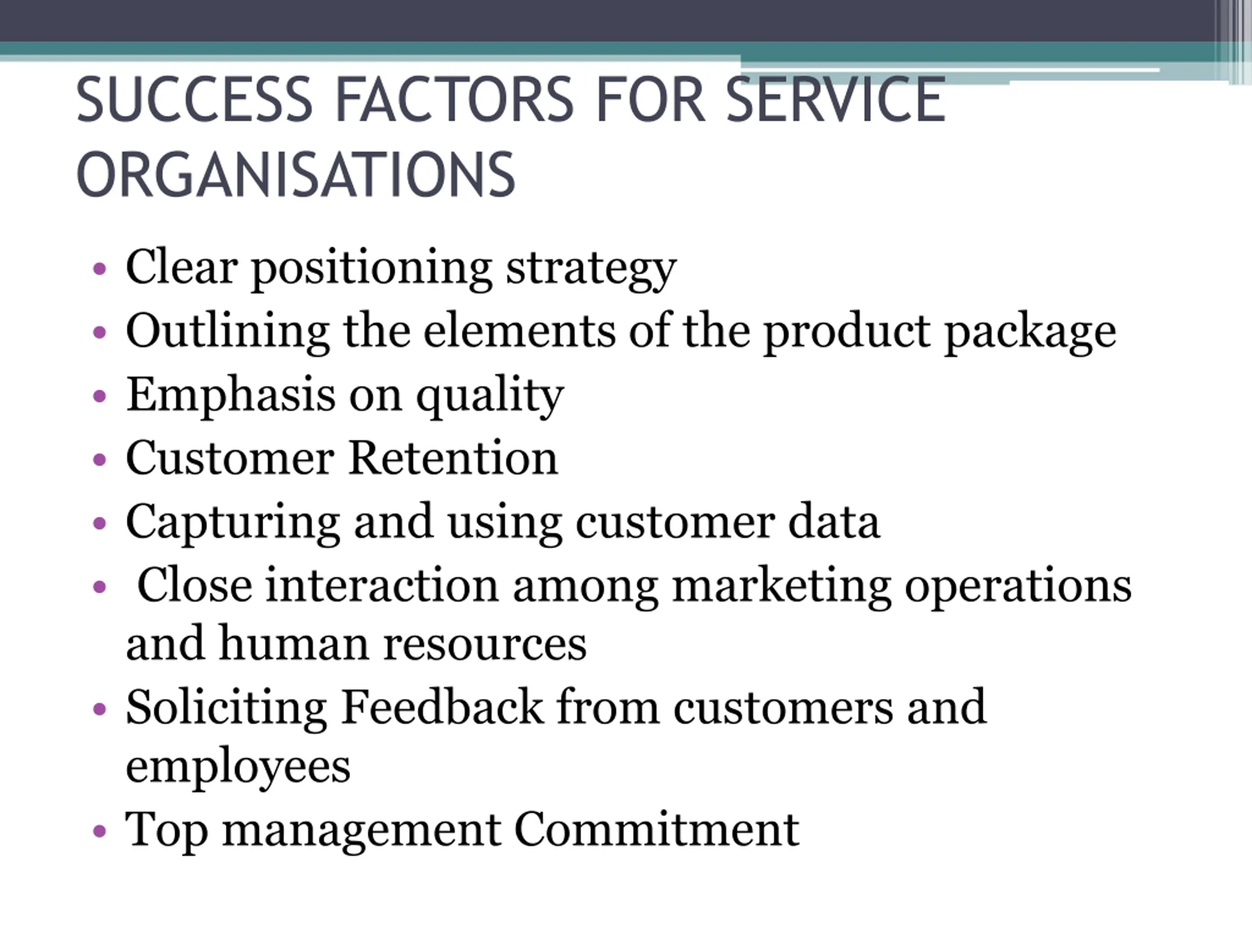 SUCCESS FACTORS FOR SERVICE ORGANISATIONS Clear positioning strategy Outlining the elements of the product package Emphasis on quality Customer Retention Capturing and using customer data Close interaction among marketing operations and human resources Soliciting Feedback from customers and employees Top management Commitment