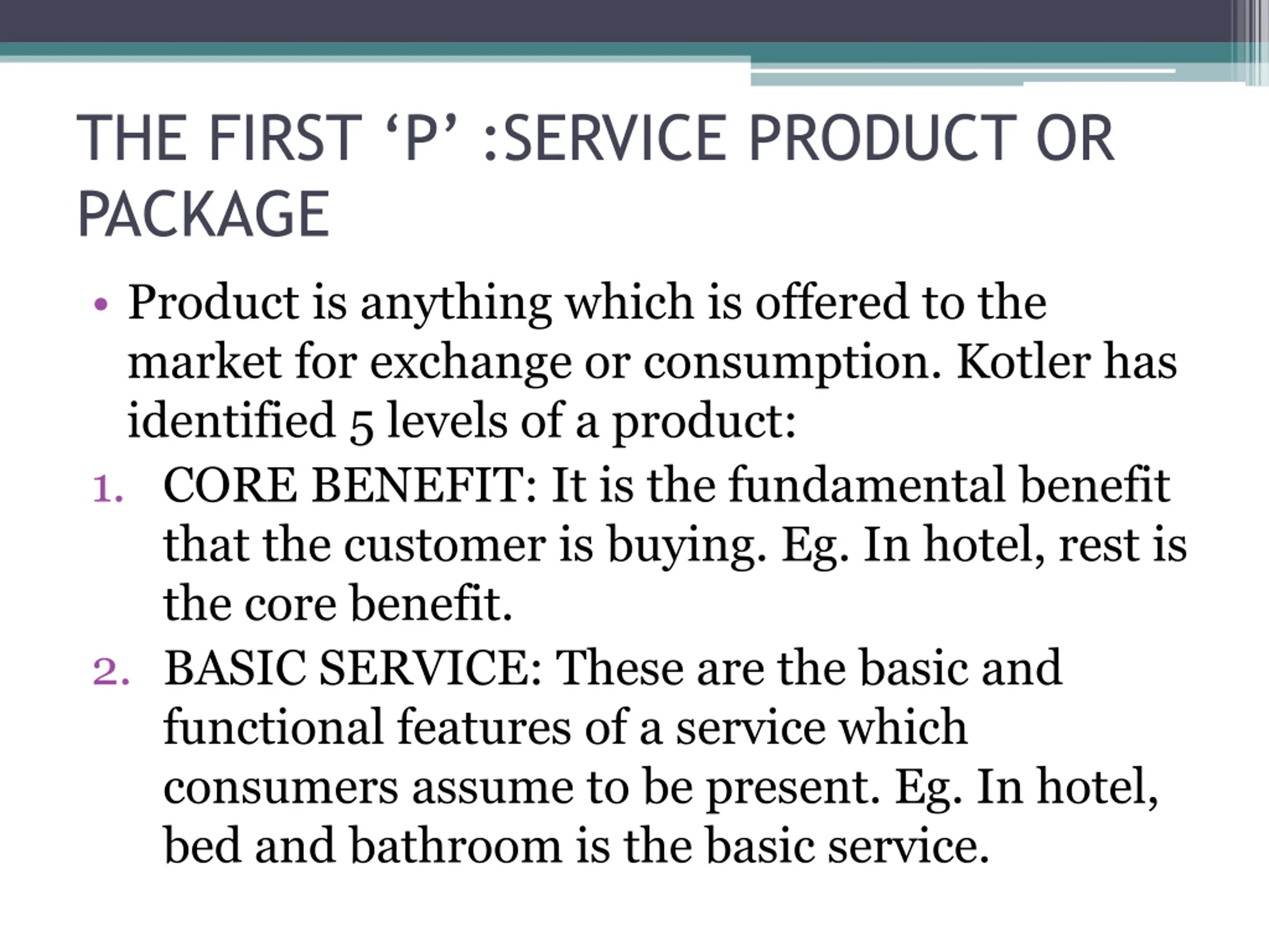 THE FIRST P :SERVICE PRODUCT OR PACKAGE Product is anything which is offered to the market for exchange or consumption. Kotler has identified 5 levels of a product: 1. CORE BENEFIT: It is the fundamental benefit that the customer is buying. Eg. In hotel, rest is the core benefit. 2. BASIC SERVICE: These are the basic and functional features of a service which consumers assume to be present. Eg. In hotel, bed and bathroom is the basic service.