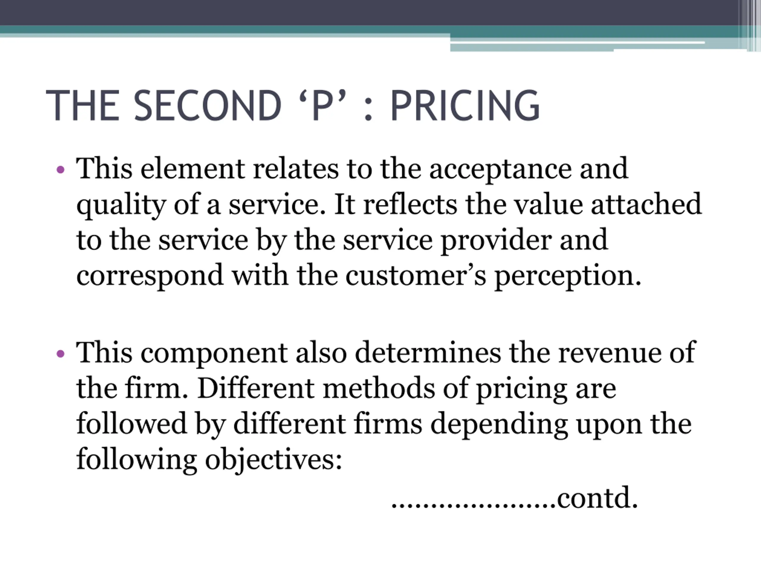 THE SECOND P : PRICING This element relates to the acceptance and quality of a service. It reflects the value attached to the service by the service provider and correspond with the customer s perception. This component also determines the revenue of the firm. Different methods of pricing are followed by different firms depending upon the following objectives: .....................contd.