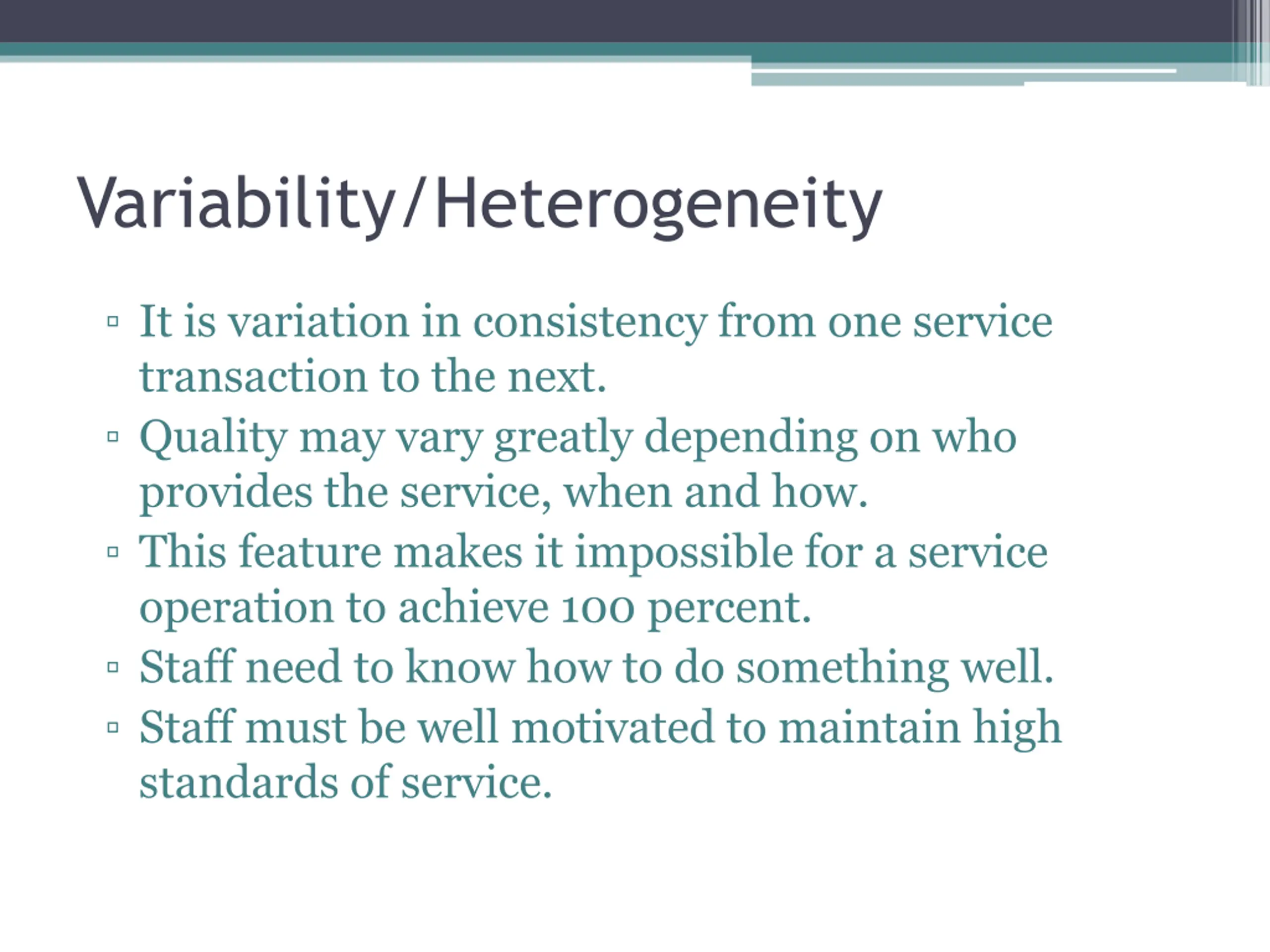 Variability/Heterogeneity It is variation in consistency from one service transaction to the next. Quality may vary greatly depending on who provides the service, when and how. This feature makes it impossible for a service operation to achieve 100 percent. Staff need to know how to do something well. Staff must be well motivated to maintain high standards of service.