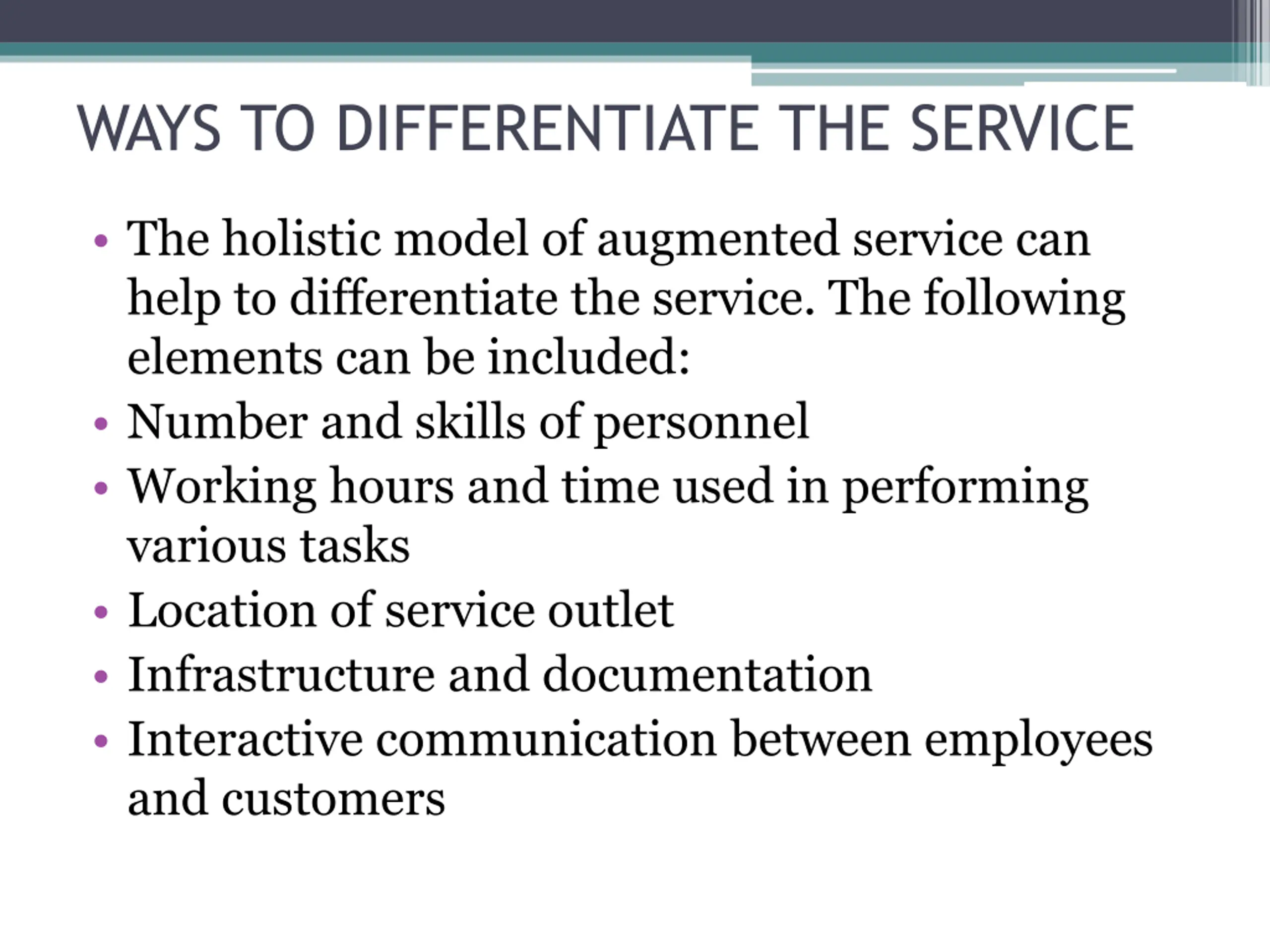 WAYS TO DIFFERENTIATE THE SERVICE The holistic model of augmented service can help to differentiate the service. The following elements can be included: Number and skills of personnel Working hours and time used in performing various tasks Location of service outlet Infrastructure and documentation Interactive communication between employees and customers