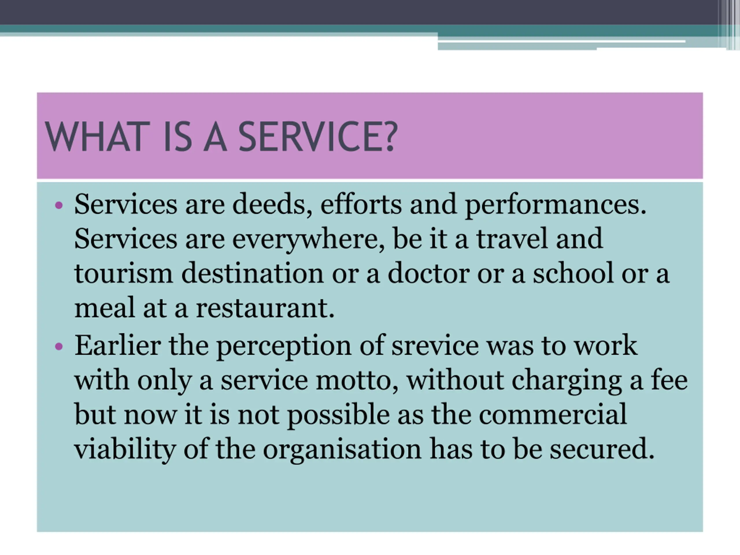 WHAT IS A SERVICE? Services are deeds, efforts and performances. Services are everywhere, be it a travel and tourism destination or a doctor or a school or a meal at a restaurant. Earlier the perception of srevice was to work with only a service motto, without charging a fee but now it is not possible as the commercial viability of the organisation has to be secured.