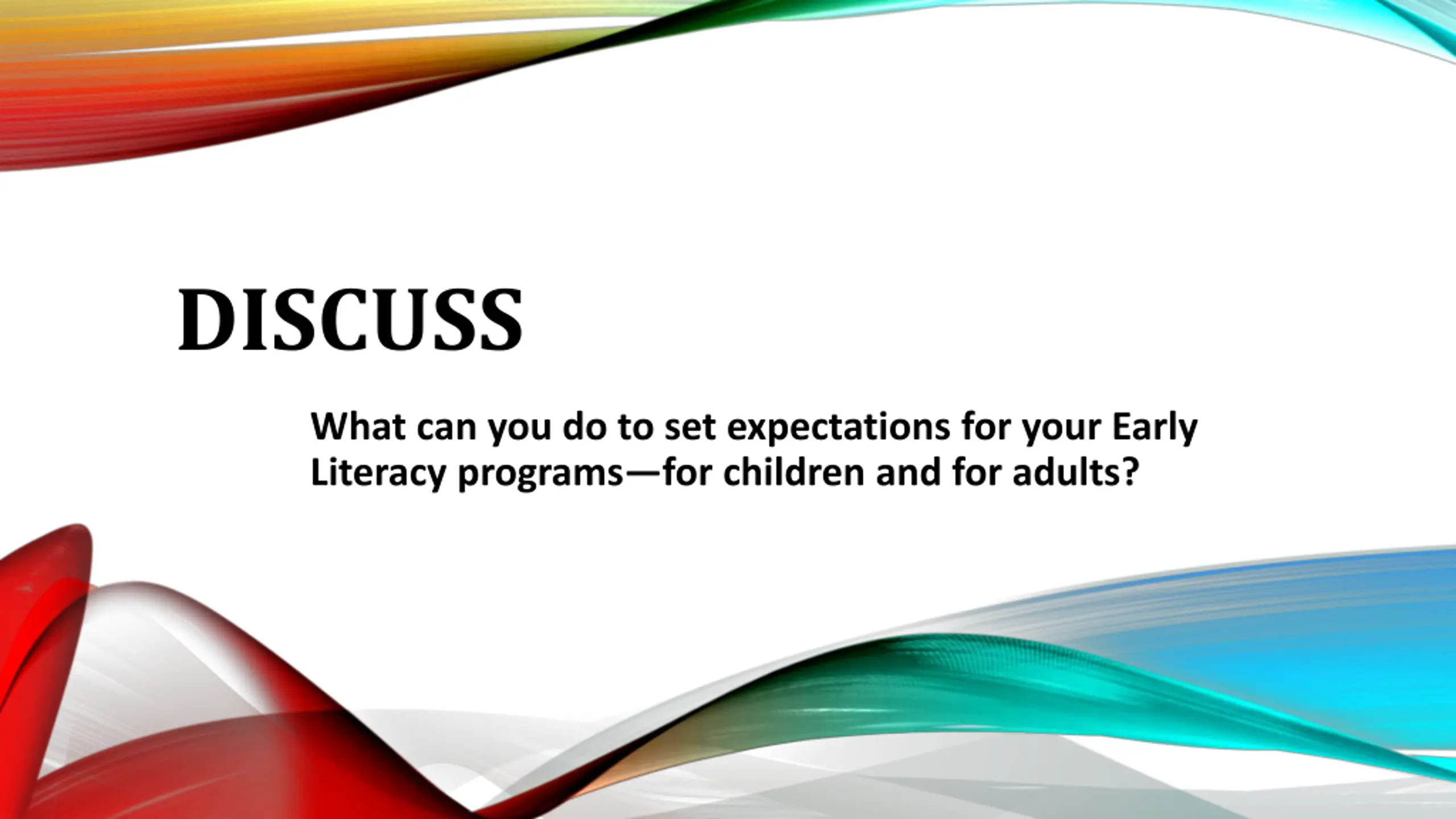 DISCUSS What can you do to set expectations for your Early Literacy programs for children and for adults?