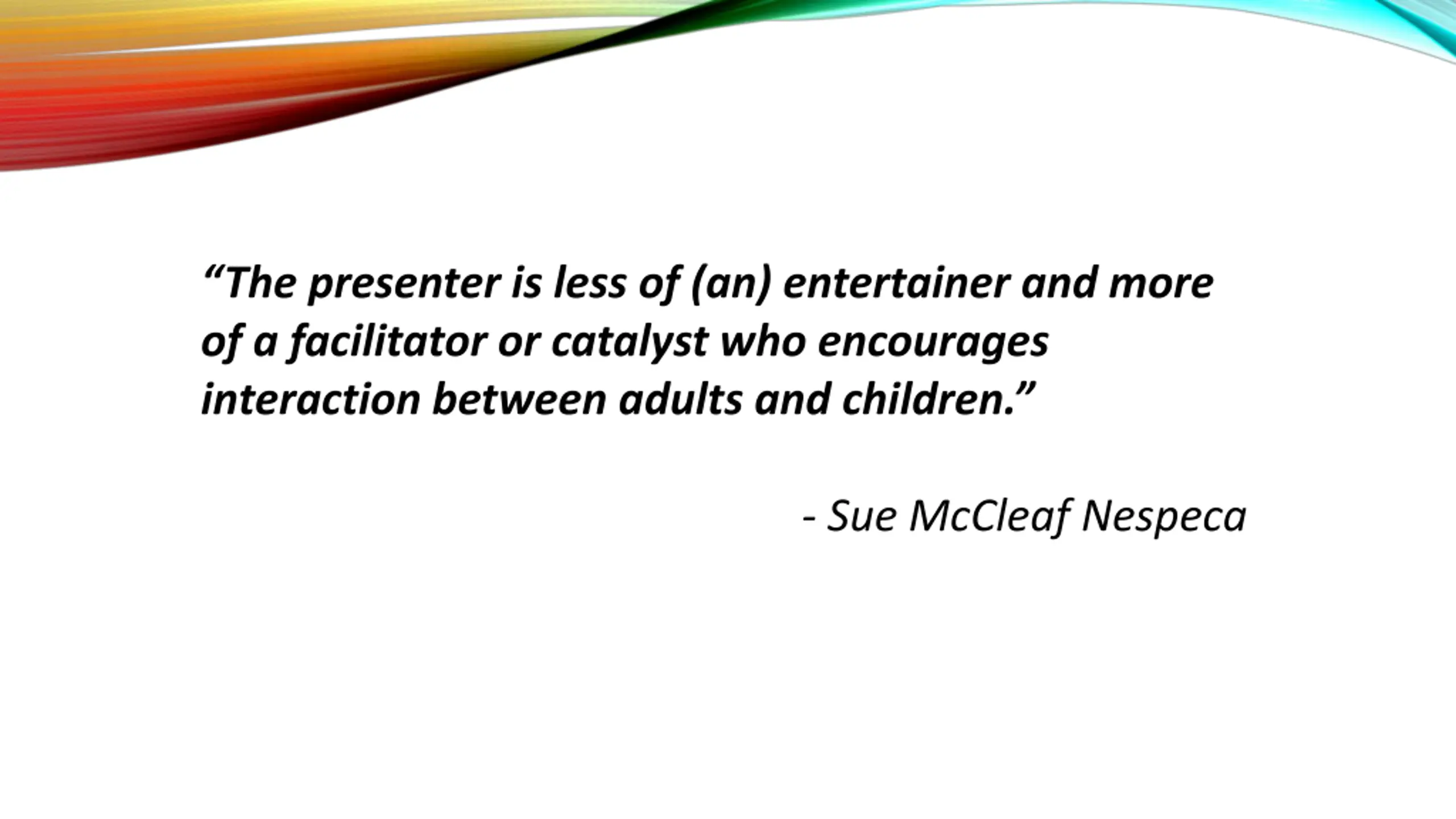 The presenter is less of (an) entertainer and more of a facilitator or catalyst who encourages interaction between adults and children. - Sue McCleaf Nespeca