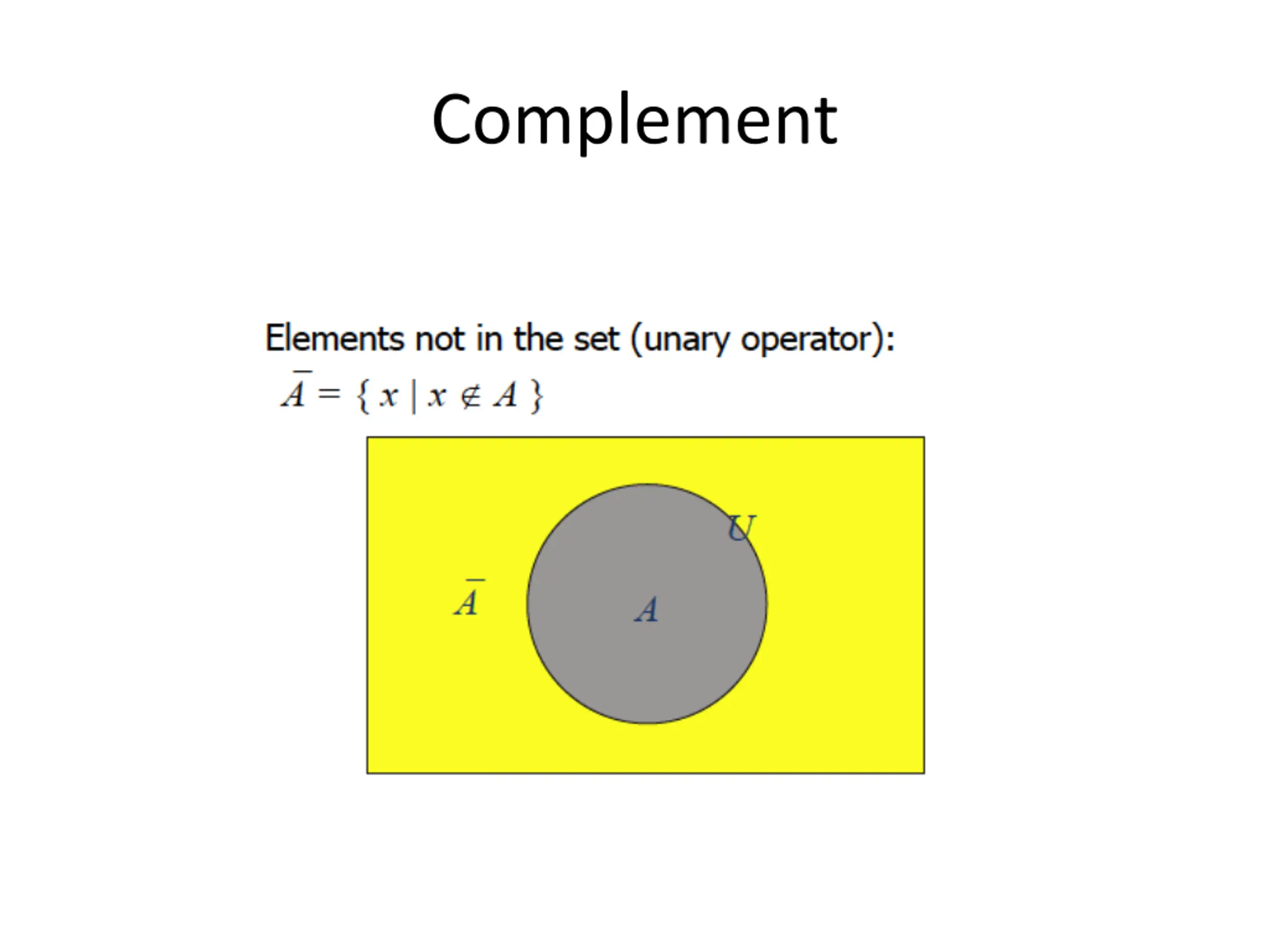 Set difference & complement Let A = {1, 2, 3, 4, 5} and B = {0, 2, 5, 8} A B = {x | x A x B} So, in this case, A B = {1, 3, 4} Also A = {x | x A}