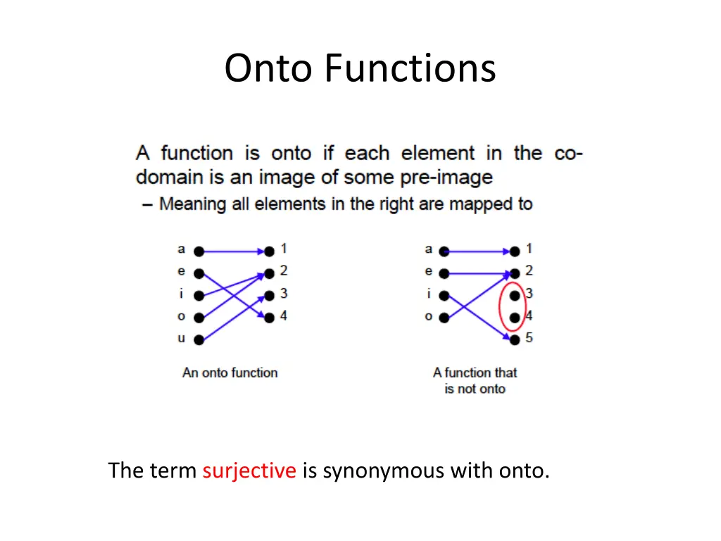 Onto Functions The term surjective is synonymous with onto.