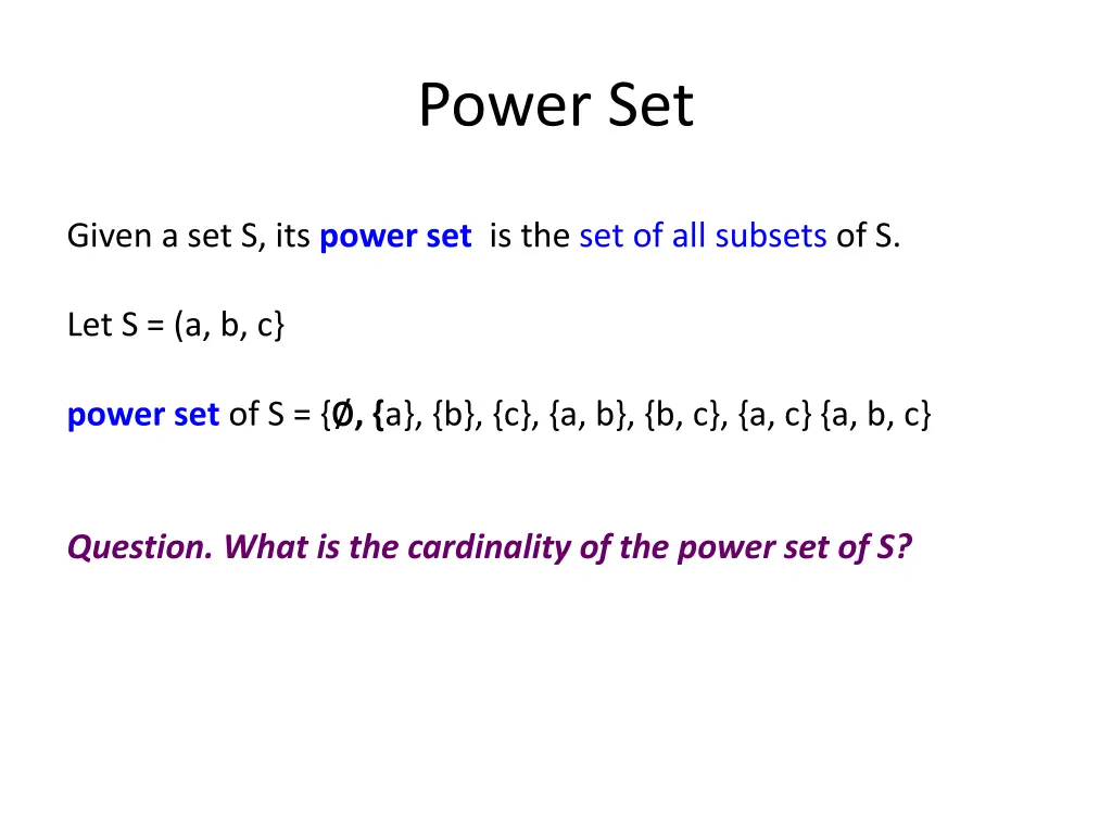 Power Set Given a set S, its power set is the set of all subsets of S. Let S = (a, b, c} power set of S = { , {a}, {b}, {c}, {a, b}, {b, c}, {a, c} {a, b, c} Question. What is the cardinality of the power set of S?