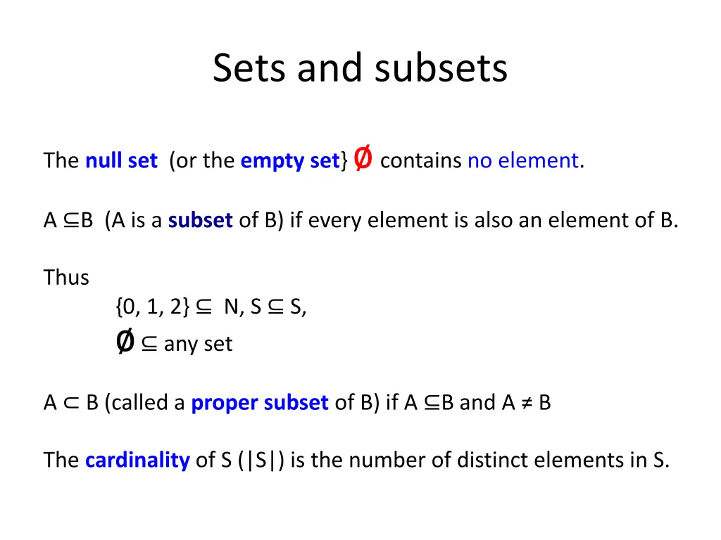 Sets and subsets The null set (or the empty set} contains no element. A B (A is a subset of B) if every element is also an element of B. Thus {0, 1, 2} N, S S, any set A B (called a proper subset of B) if A B and A B The cardinality of S (|S|) is the number of distinct elements in S.