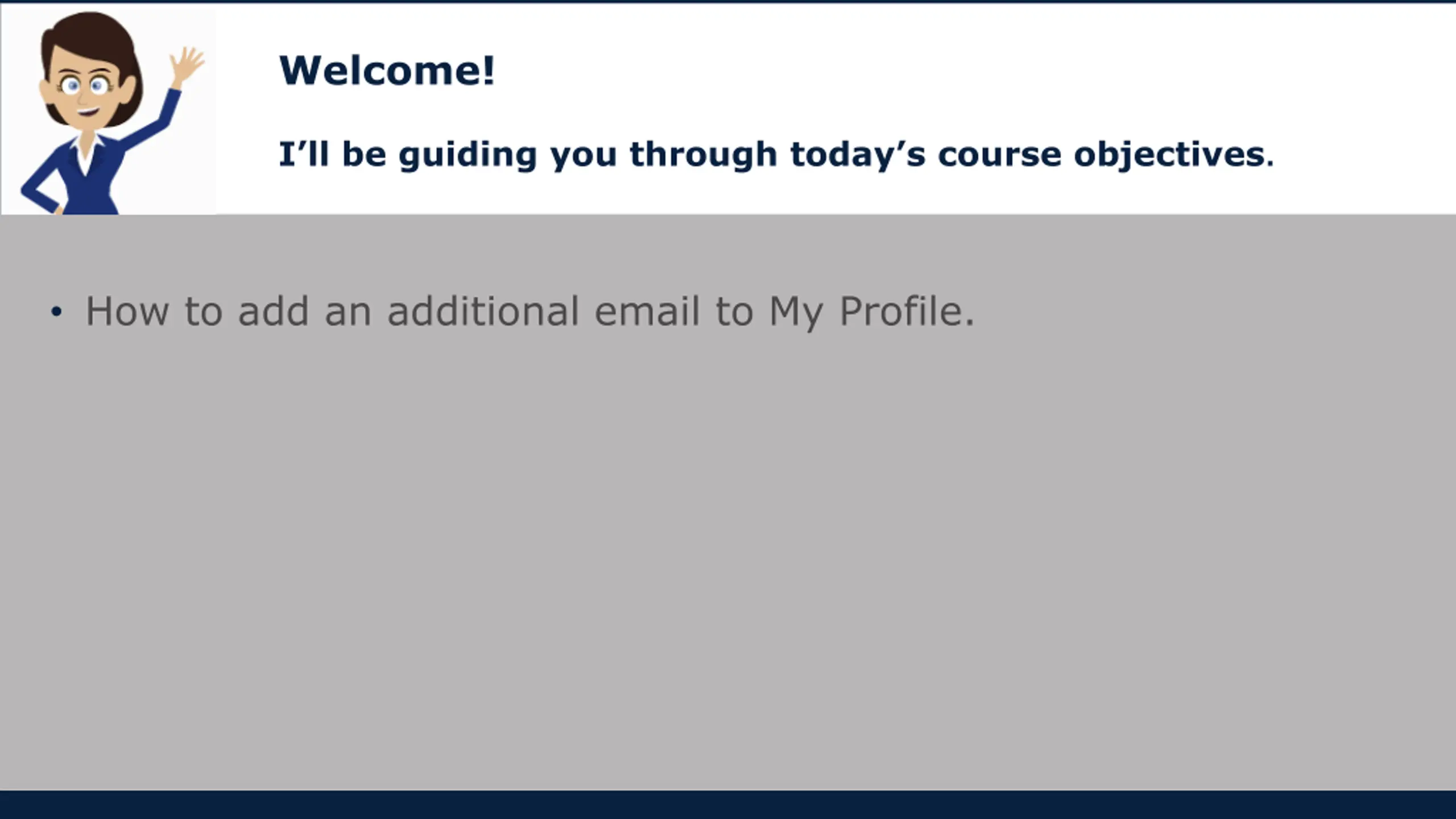 Welcome! I ll be guiding you through today s course objectives. How to add an additional email to My Profile.