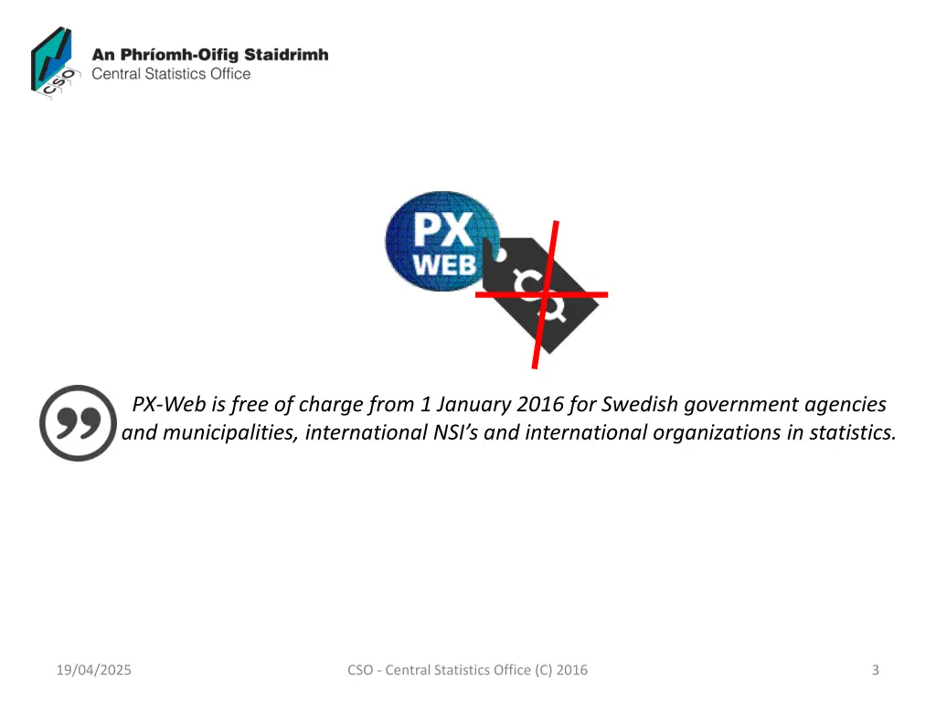 PX-Web is free of charge from 1 January 2016 for Swedish government agencies and municipalities, international NSI s and international organizations in statistics. 19/04/2025 CSO - Central Statistics Office (C) 2016 3