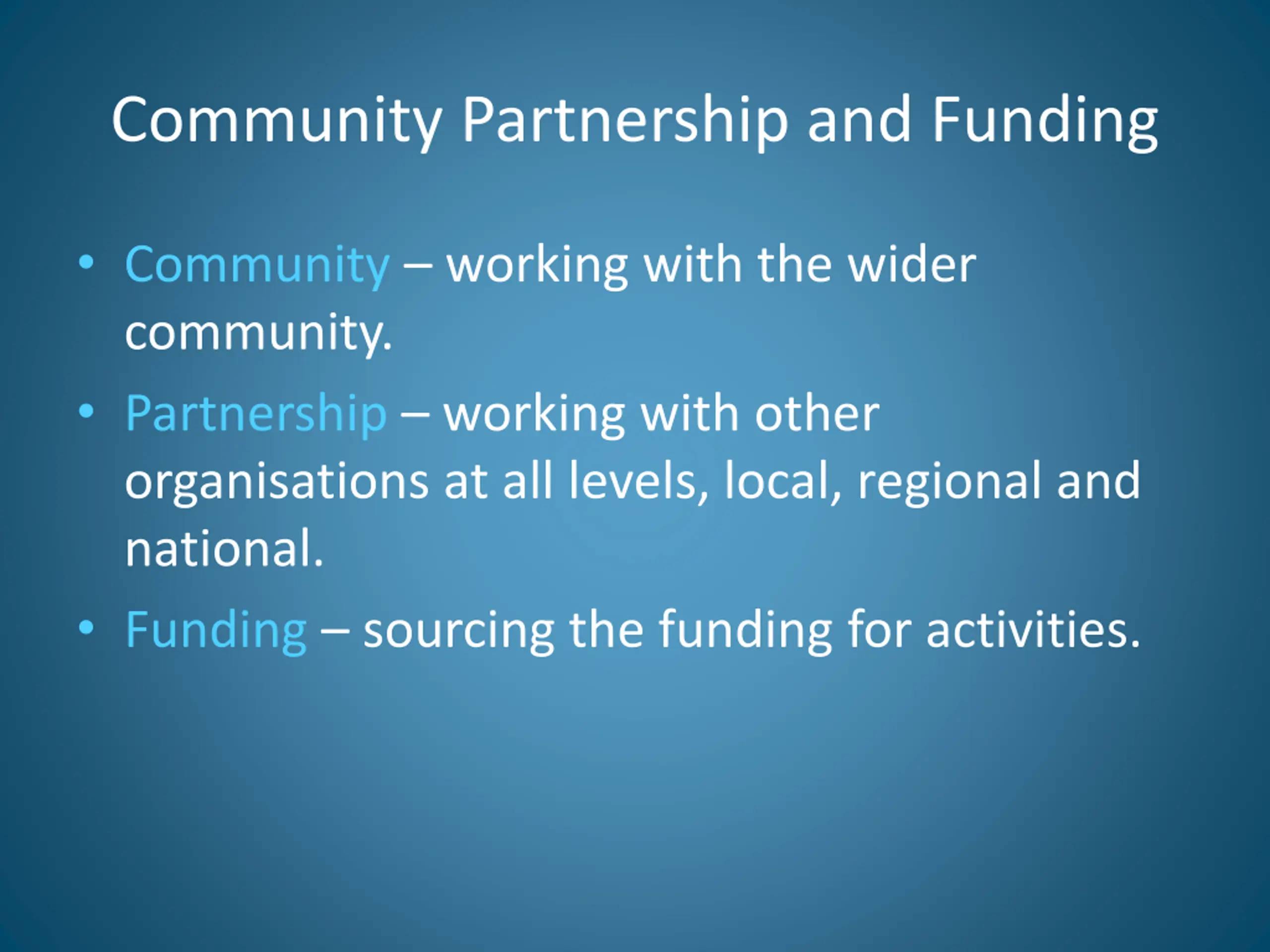 Community Partnership and Funding Community working with the wider community. Partnership working with other organisations at all levels, local, regional and national. Funding sourcing the funding for activities.