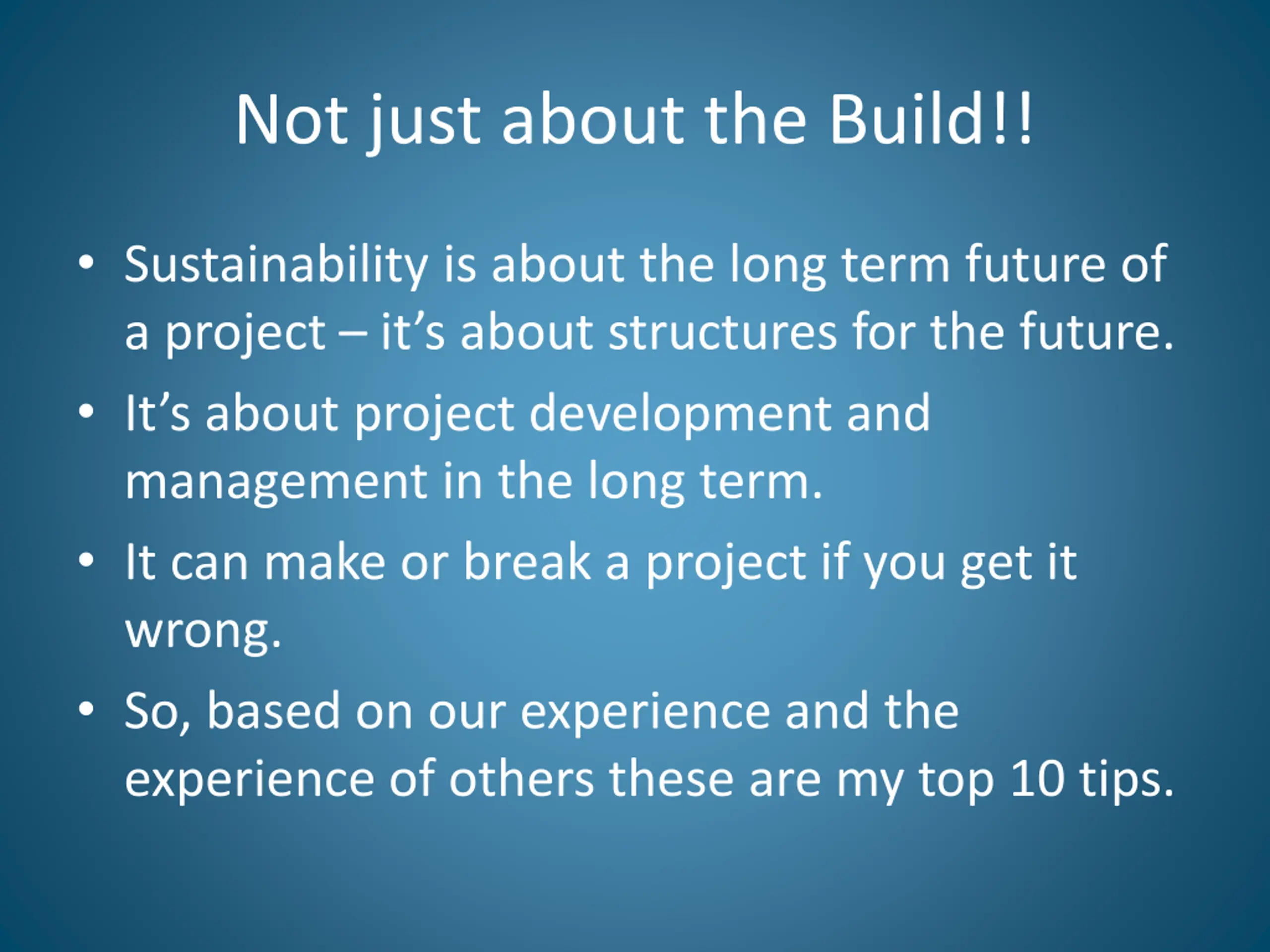 Not just about the Build!! Sustainability is about the long term future of a project it s about structures for the future. It s about project development and management in the long term. It can make or break a project if you get it wrong. So, based on our experience and the experience of others these are my top 10 tips.