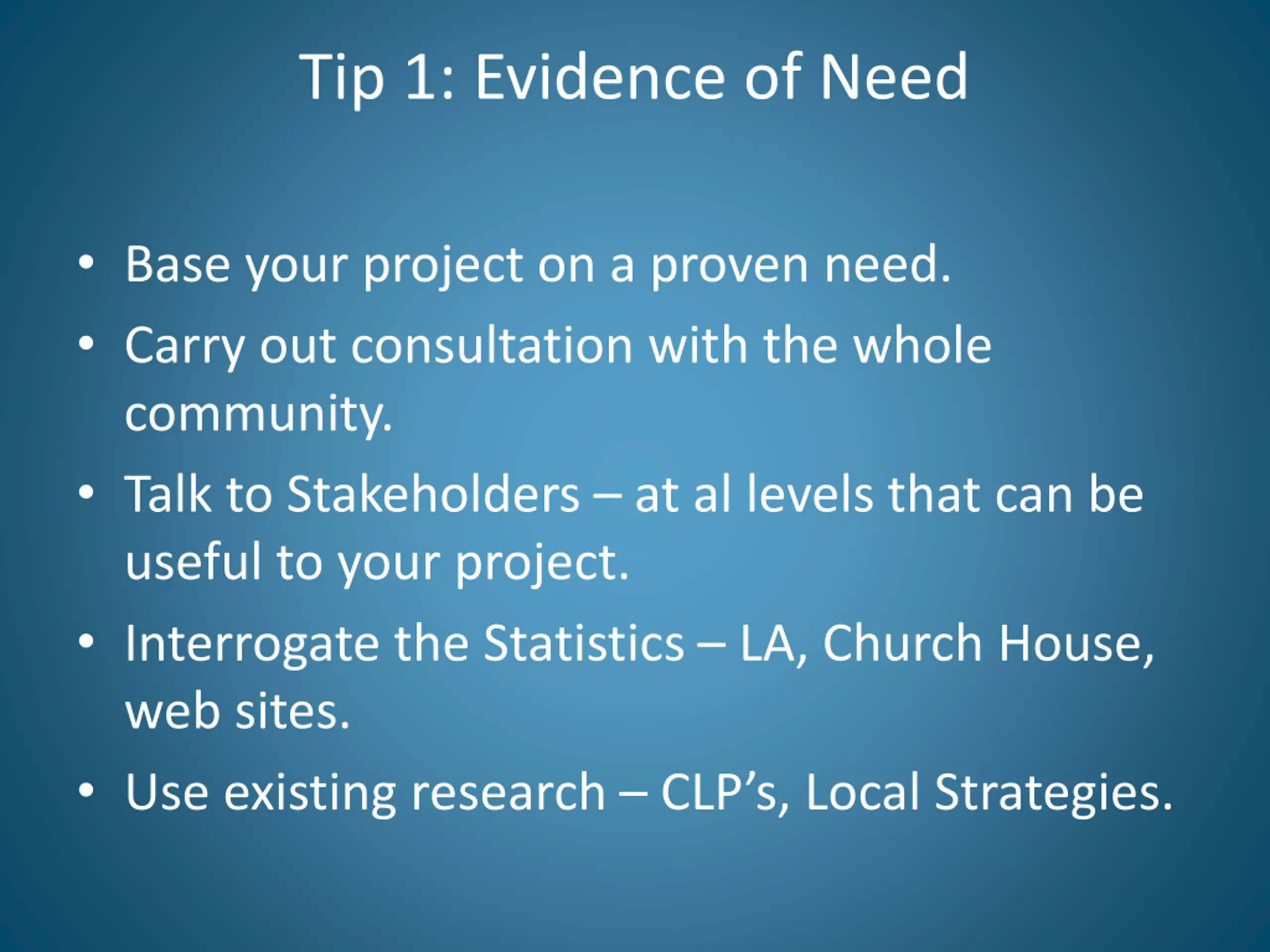Tip 1: Evidence of Need Base your project on a proven need. Carry out consultation with the whole community. Talk to Stakeholders at al levels that can be useful to your project. Interrogate the Statistics LA, Church House, web sites. Use existing research CLP s, Local Strategies.