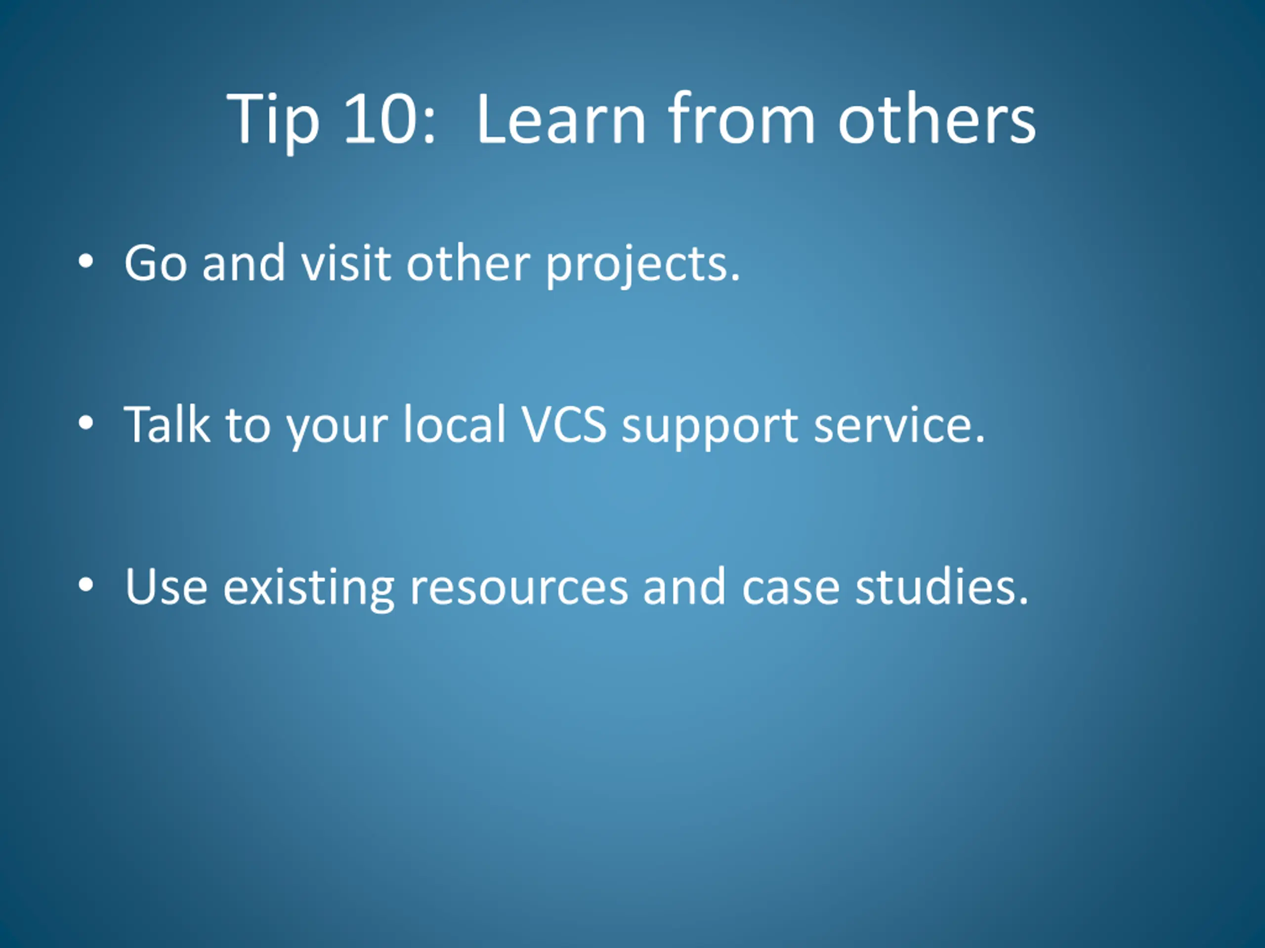 Tip 10: Learn from others Go and visit other projects. Talk to your local VCS support service. Use existing resources and case studies.