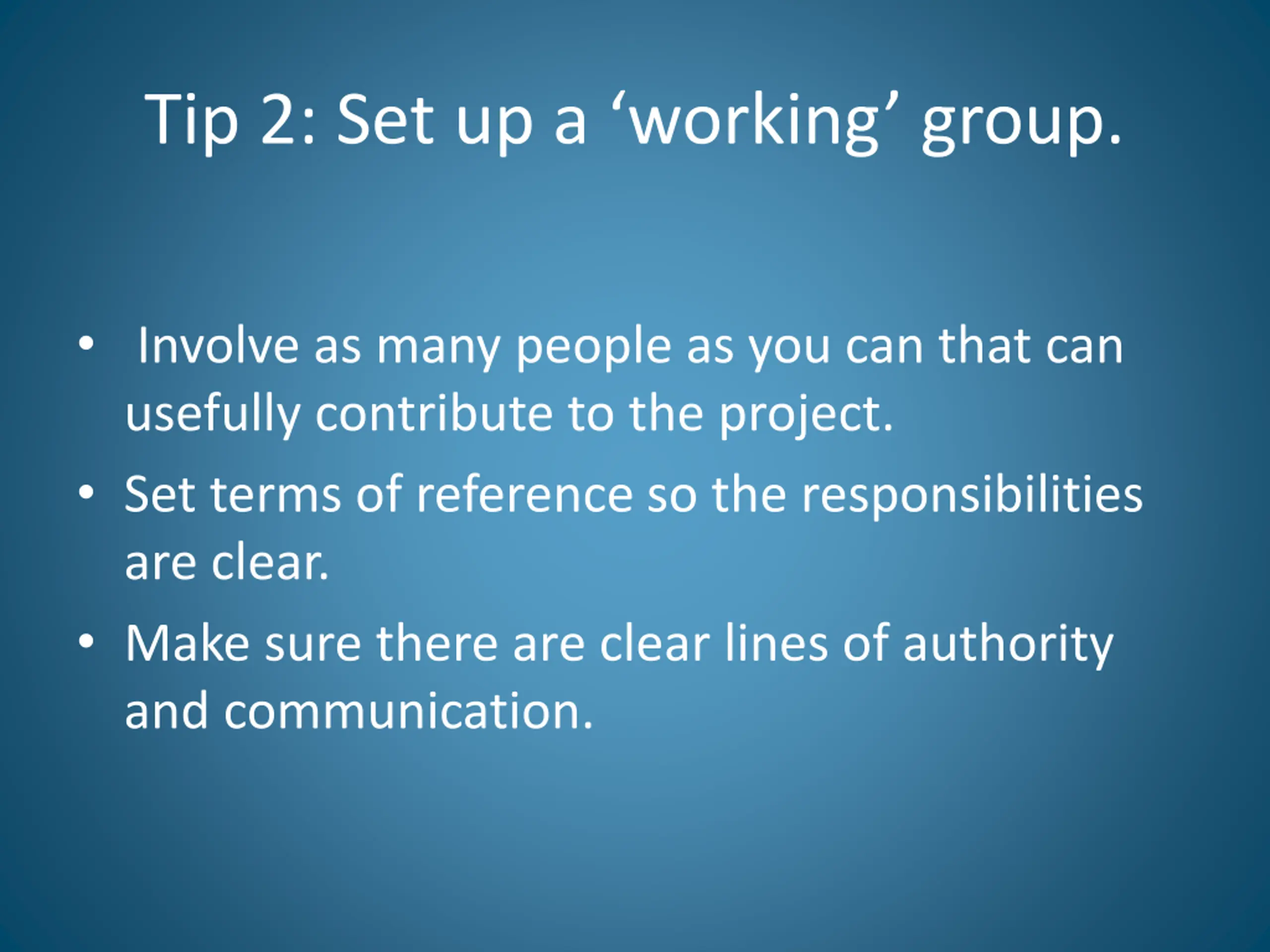 Tip 2: Set up a working group. Involve as many people as you can that can usefully contribute to the project. Set terms of reference so the responsibilities are clear. Make sure there are clear lines of authority and communication.
