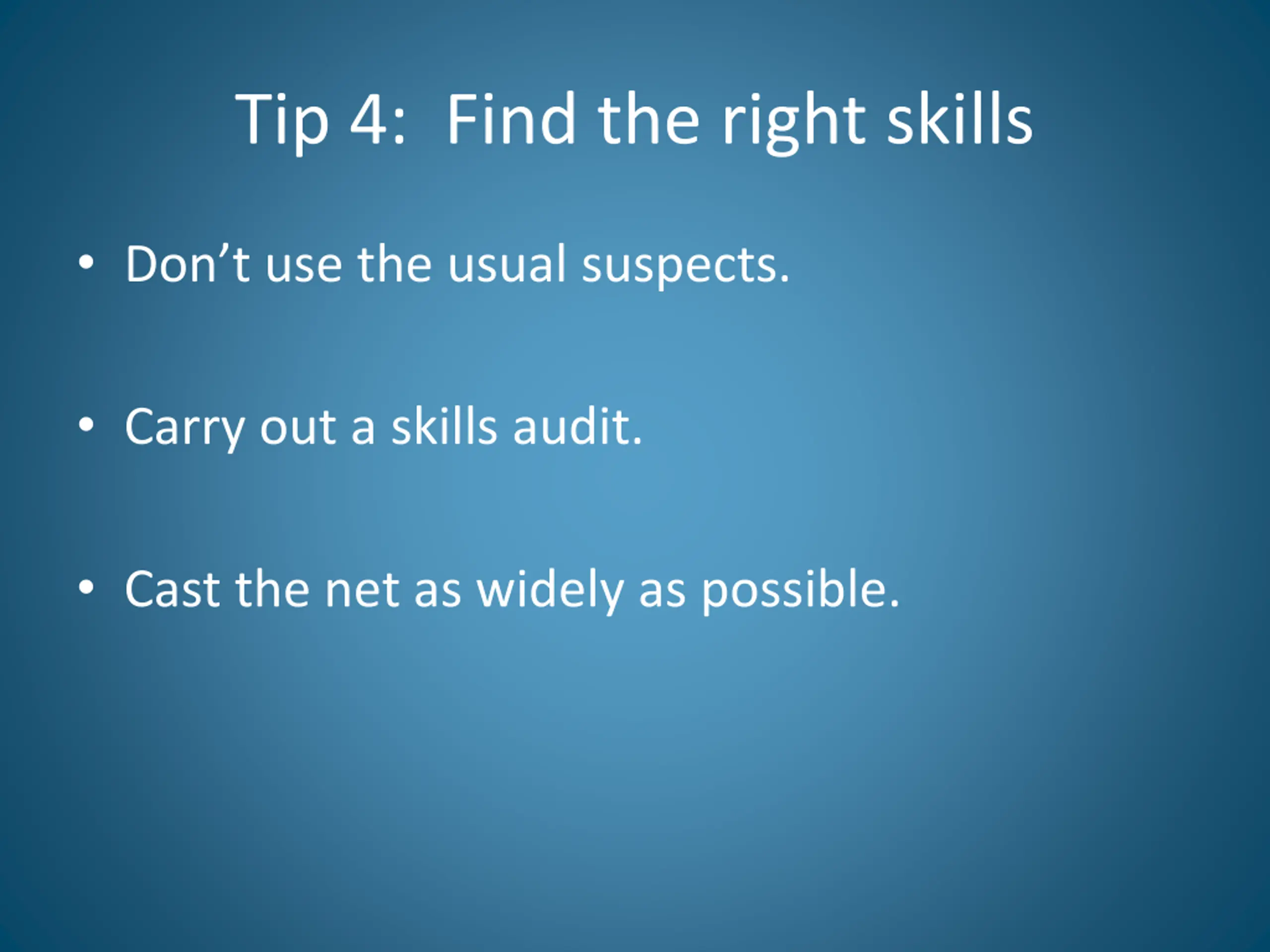 Tip 4: Find the right skills Don t use the usual suspects. Carry out a skills audit. Cast the net as widely as possible.