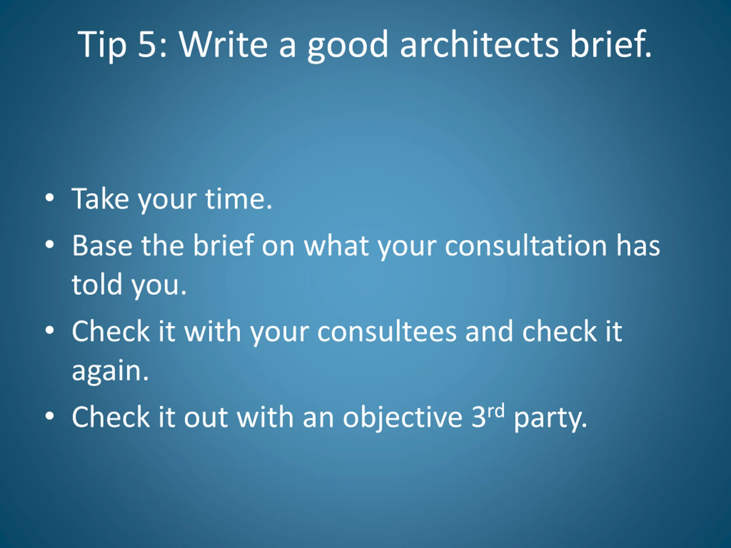 Tip 5: Write a good architects brief. Take your time. Base the brief on what your consultation has told you. Check it with your consultees and check it again. Check it out with an objective 3rdparty.