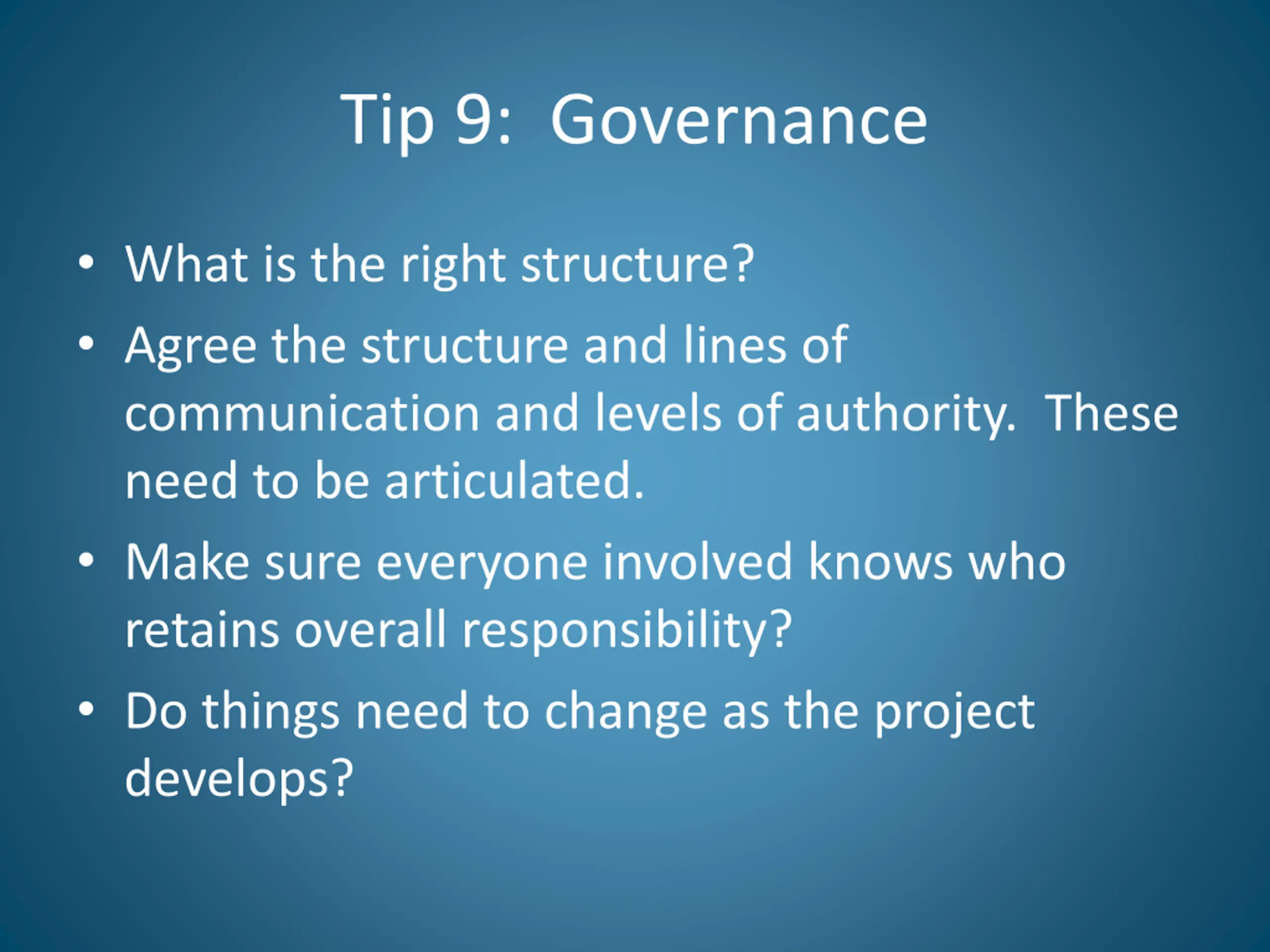 Tip 9: Governance What is the right structure? Agree the structure and lines of communication and levels of authority. These need to be articulated. Make sure everyone involved knows who retains overall responsibility? Do things need to change as the project develops?