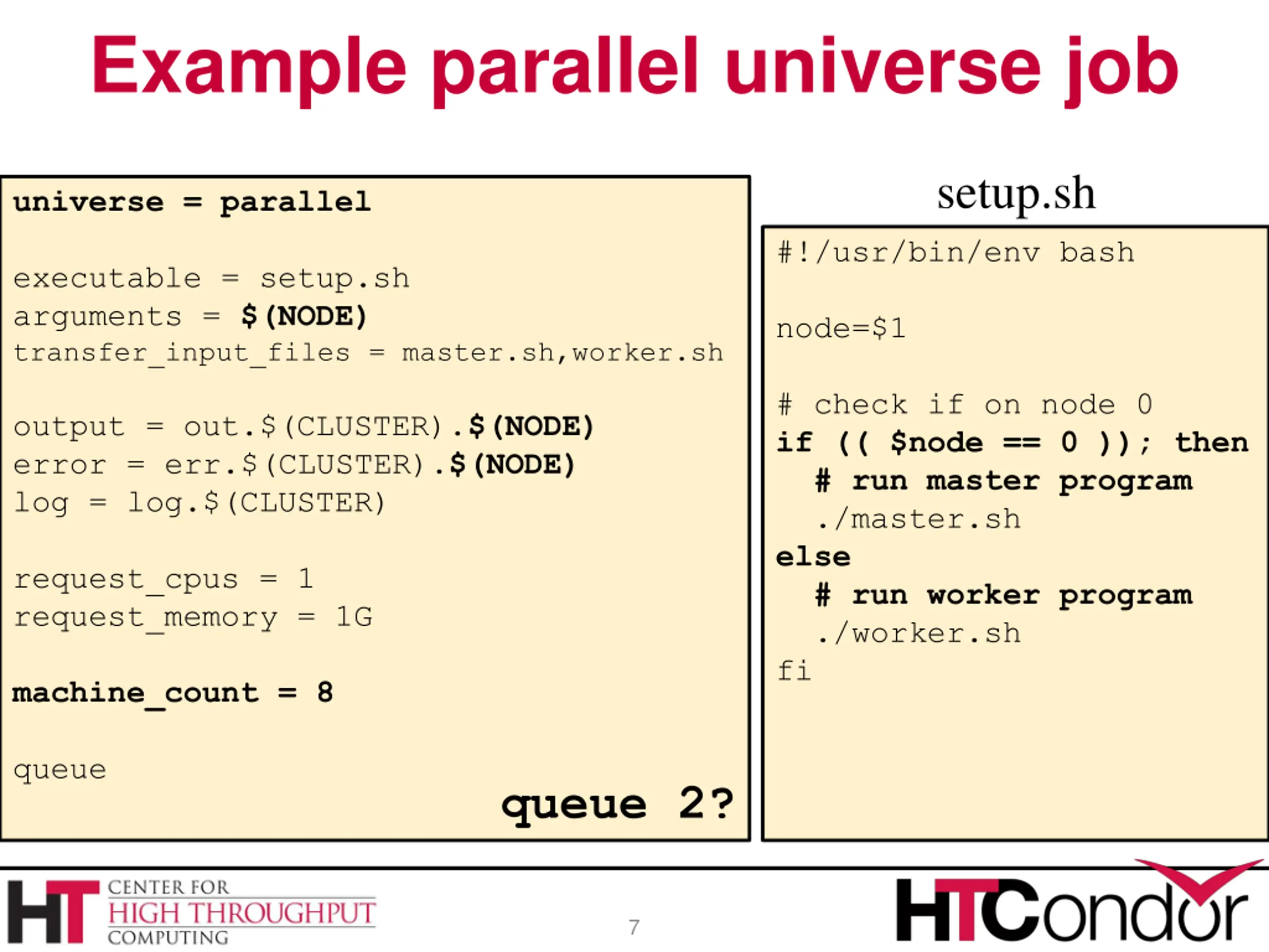 Example parallel universe job setup.sh universe = parallel #!/usr/bin/env bash executable = setup.sh arguments = $(NODE) transfer_input_files = master.sh,worker.sh node=$1 # check if on node 0 if (( $node == 0 )); then # run master program ./master.sh else # run worker program ./worker.sh fi output = out.$(CLUSTER).$(NODE) error = err.$(CLUSTER).$(NODE) log = log.$(CLUSTER) request_cpus = 1 request_memory = 1G machine_count = 8 queue queue 2? 7