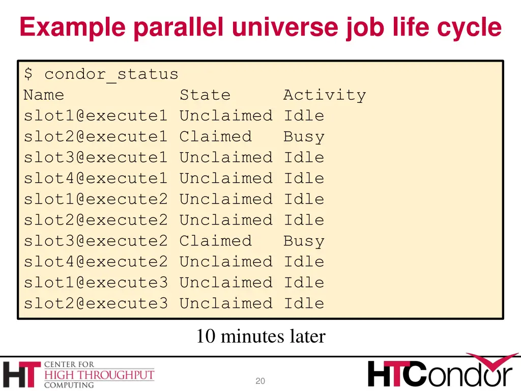 Example parallel universe job life cycle $ condor_status Name State Activity slot1@execute1 Unclaimed Idle slot2@execute1 Claimed Busy slot3@execute1 Unclaimed Idle slot4@execute1 Unclaimed Idle slot1@execute2 Unclaimed Idle slot2@execute2 Unclaimed Idle slot3@execute2 Claimed Busy slot4@execute2 Unclaimed Idle slot1@execute3 Unclaimed Idle slot2@execute3 Unclaimed Idle 10 minutes later 20