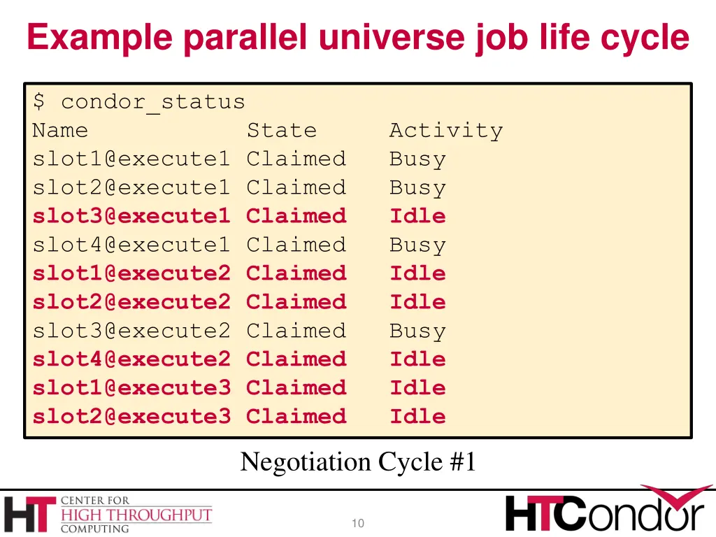 Example parallel universe job life cycle $ condor_status Name State Activity slot1@execute1 Claimed Busy slot2@execute1 Claimed Busy slot3@execute1 Claimed Idle slot4@execute1 Claimed Busy slot1@execute2 Claimed Idle slot2@execute2 Claimed Idle slot3@execute2 Claimed Busy slot4@execute2 Claimed Idle slot1@execute3 Claimed Idle slot2@execute3 Claimed Idle Negotiation Cycle #1 10