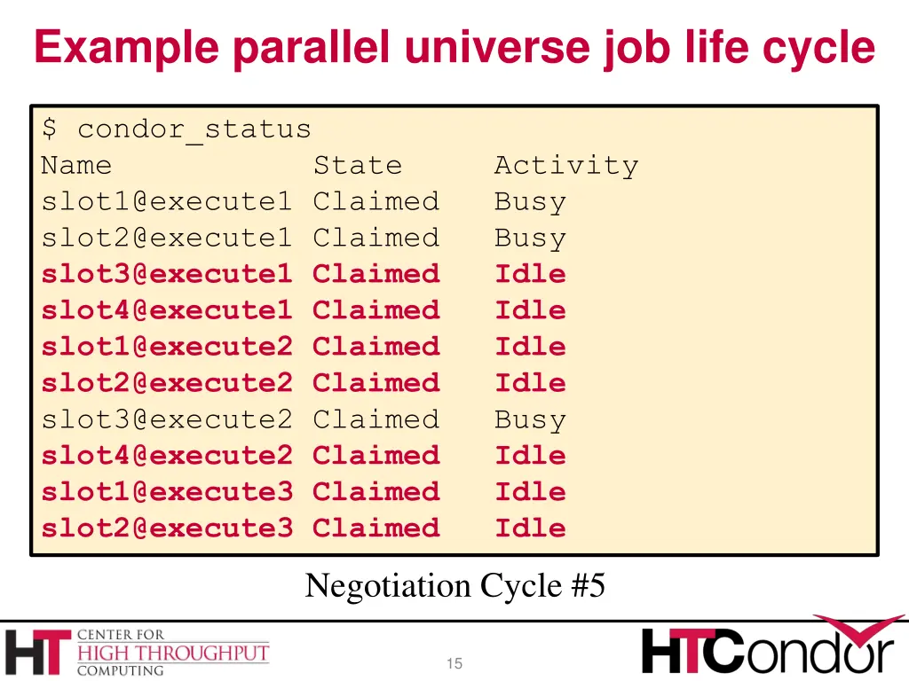 Example parallel universe job life cycle $ condor_status Name State Activity slot1@execute1 Claimed Busy slot2@execute1 Claimed Busy slot3@execute1 Claimed Idle slot4@execute1 Claimed Idle slot1@execute2 Claimed Idle slot2@execute2 Claimed Idle slot3@execute2 Claimed Busy slot4@execute2 Claimed Idle slot1@execute3 Claimed Idle slot2@execute3 Claimed Idle Negotiation Cycle #4 14