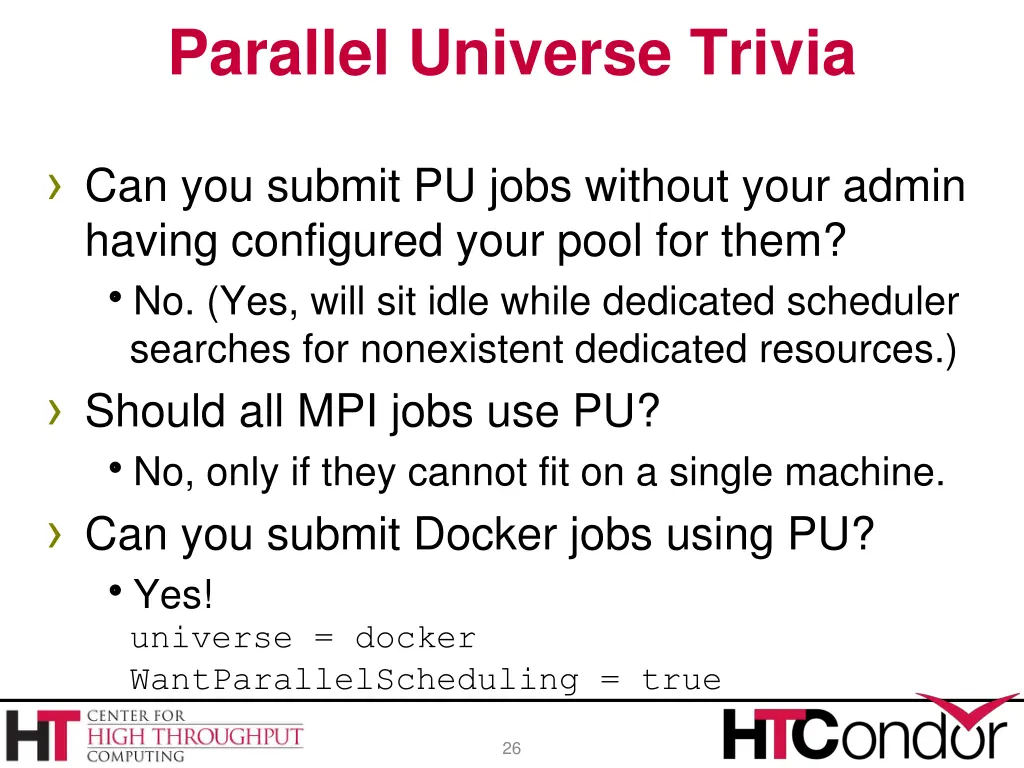 Parallel Universe Trivia Can you submit PU jobs without your admin having configured your pool for them? No. (Yes, will sit idle while dedicated scheduler searches for nonexistent dedicated resources.) Should all MPI jobs use PU? No, only if they cannot fit on a single machine. Can you submit Docker jobs using PU? Yes! universe = docker WantParallelScheduling = true 26