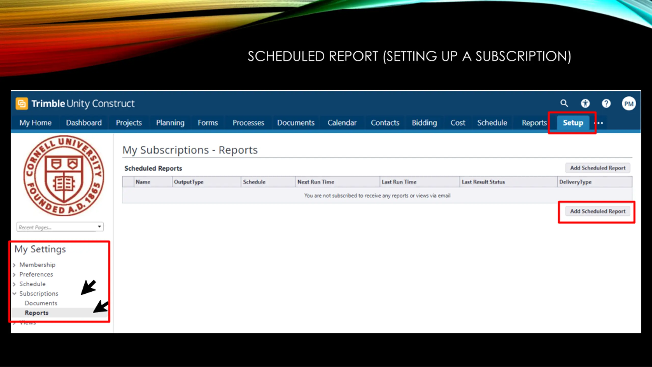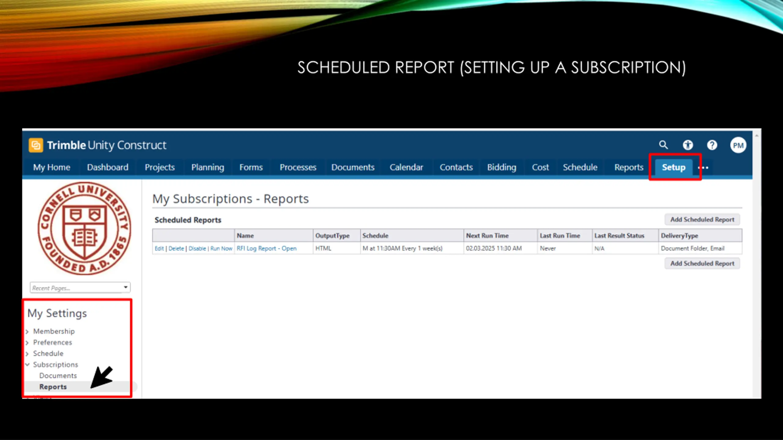 Learn how to efficiently manage subscriptions by setting up scheduled reports. Find step-by-step guidance and tips for optimizing subscription processes in Trimble.Unity.Construct.TIPS.PMPD.February.2025.