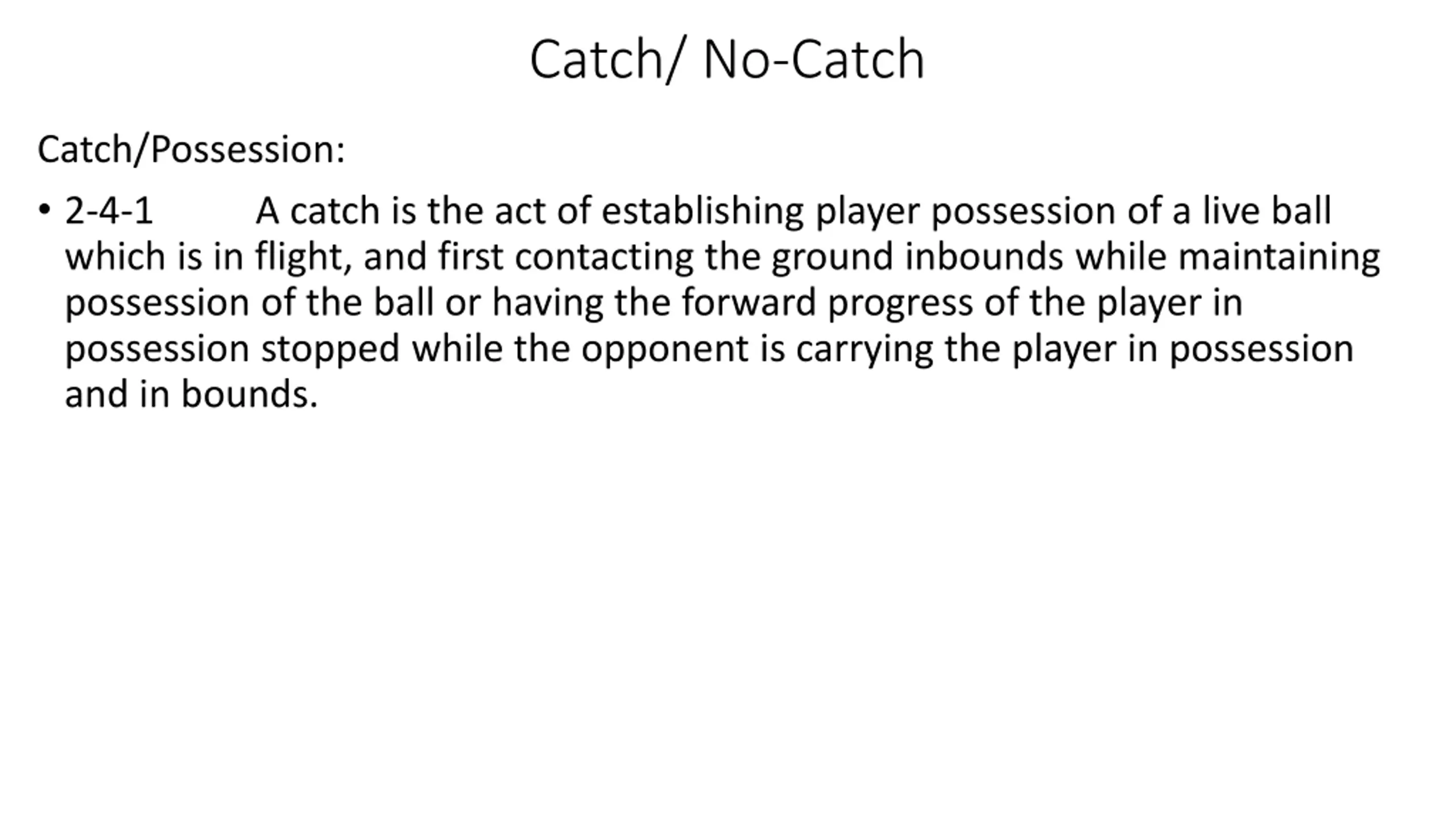 Catch/ No-Catch Catch/Possession: 2-4-1 which is in flight, and first contacting the ground inbounds while maintaining possession of the ball or having the forward progress of the player in possession stopped while the opponent is carrying the player in possession and in bounds. A catch is the act of establishing player possession of a live ball