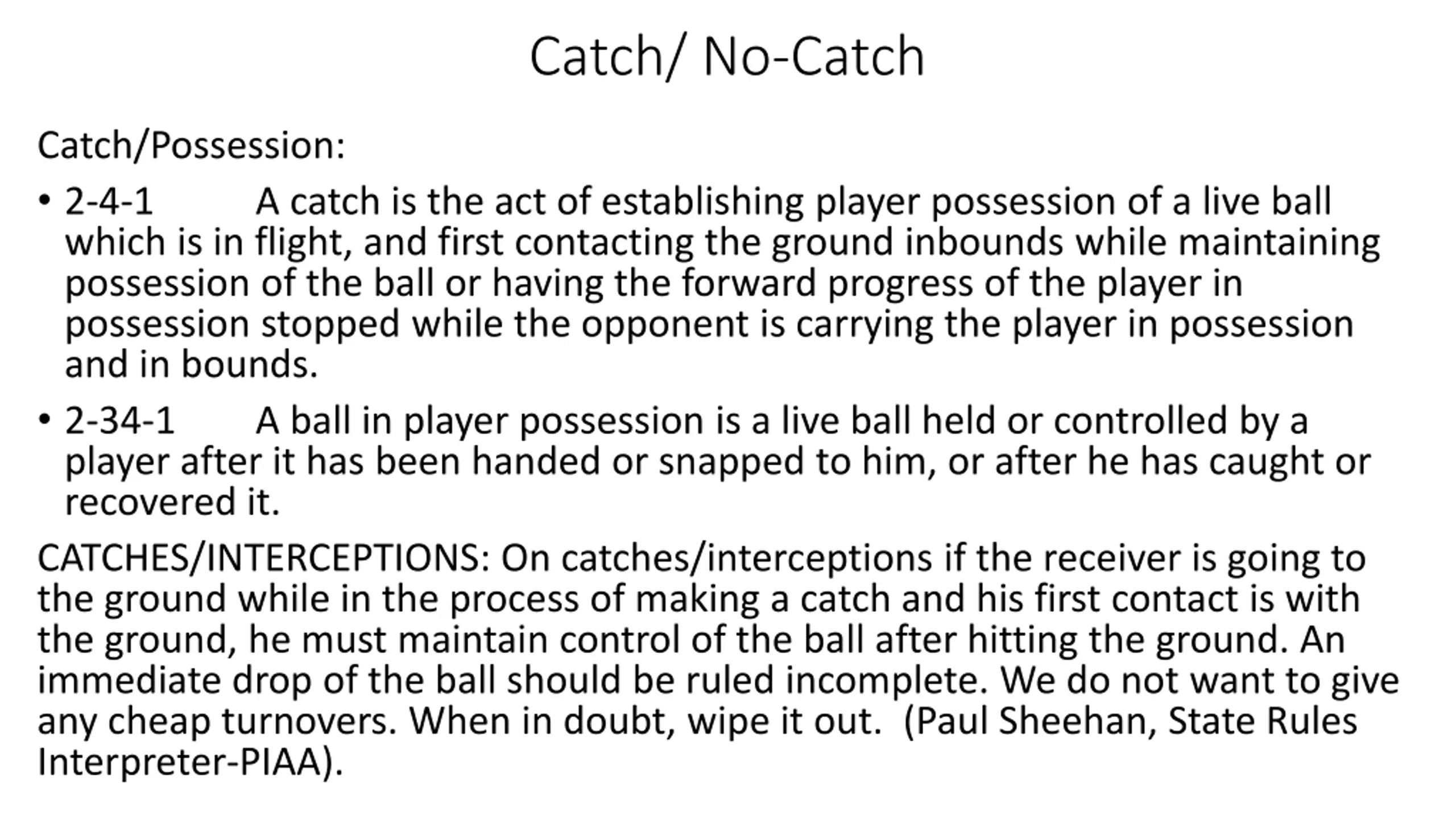 Catch/ No-Catch Catch/Possession: 2-4-1 which is in flight, and first contacting the ground inbounds while maintaining possession of the ball or having the forward progress of the player in possession stopped while the opponent is carrying the player in possession and in bounds. 2-34-1 A ball in player possession is a live ball held or controlled by a player after it has been handed or snapped to him, or after he has caught or recovered it. CATCHES/INTERCEPTIONS: On catches/interceptions if the receiver is going to the ground while in the process of making a catch and his first contact is with the ground, he must maintain control of the ball after hitting the ground. An immediate drop of the ball should be ruled incomplete. We do not want to give any cheap turnovers. When in doubt, wipe it out. (Paul Sheehan, State Rules Interpreter-PIAA). A catch is the act of establishing player possession of a live ball