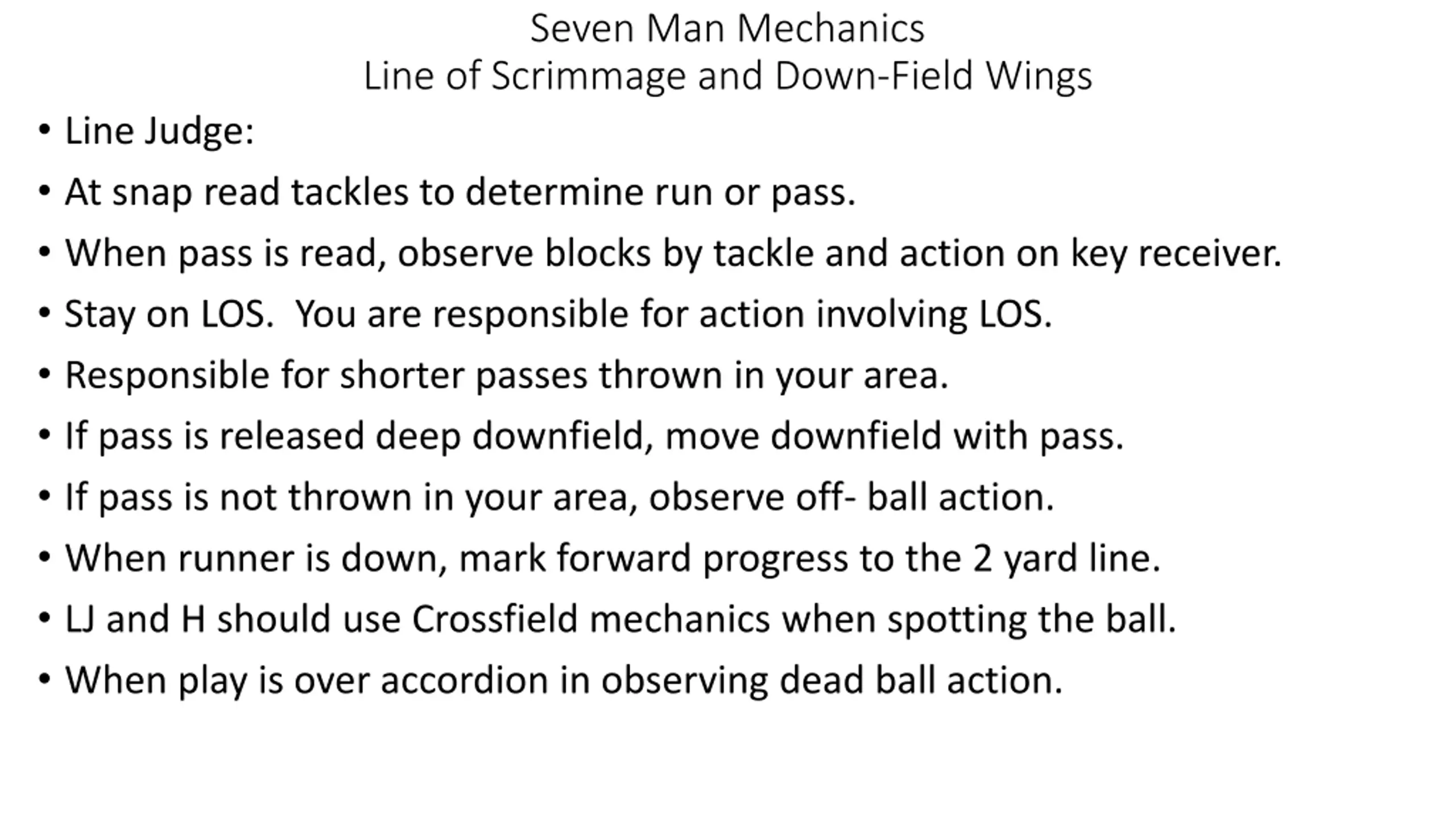 Seven Man Mechanics Line of Scrimmage and Down-Field Wings Head Linesman and Line Judge: At snap read tackles to determine run or pass. When run is read; maintain position on LOS. Observe action by tackles and keys. Do not leave line of scrimmage until runner crosses it. If play coming toward you observe blocks in advance of runner. If play goes to other side, observe action behind R and U while moving downfield with play. When getting out of bounds spot, mark spot and turn facing the action. Keep head up. Let R or downfield wing retrieve ball. H and LJ should use cross-field mechanics when spotting ball. When play is over accordion in observing dead ball action.