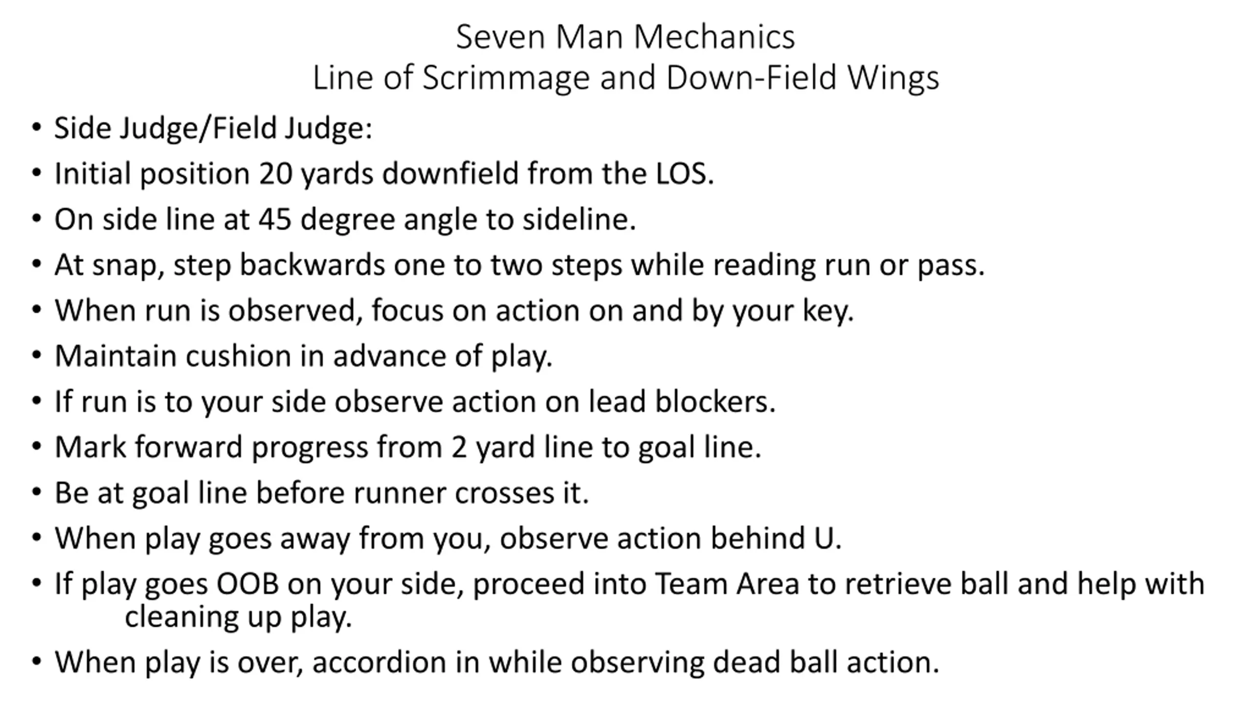 Seven Man Mechanics Line of Scrimmage and Down-Field Wings Side Judge/Field Judge: Initial position 20 yards downfield from the LOS. On side line at 45 degree angle to sideline. At snap, step backwards one to two steps while reading run or pass. When run is observed, focus on action on and by your key. Maintain cushion in advance of play. If run is to your side observe action on lead blockers. Mark forward progress from 2 yard line to goal line. Be at goal line before runner crosses it. When play goes away from you, observe action behind U. If play goes OOB on your side, proceed into Team Area to retrieve ball and help with cleaning up play. When play is over, accordion in while observing dead ball action.