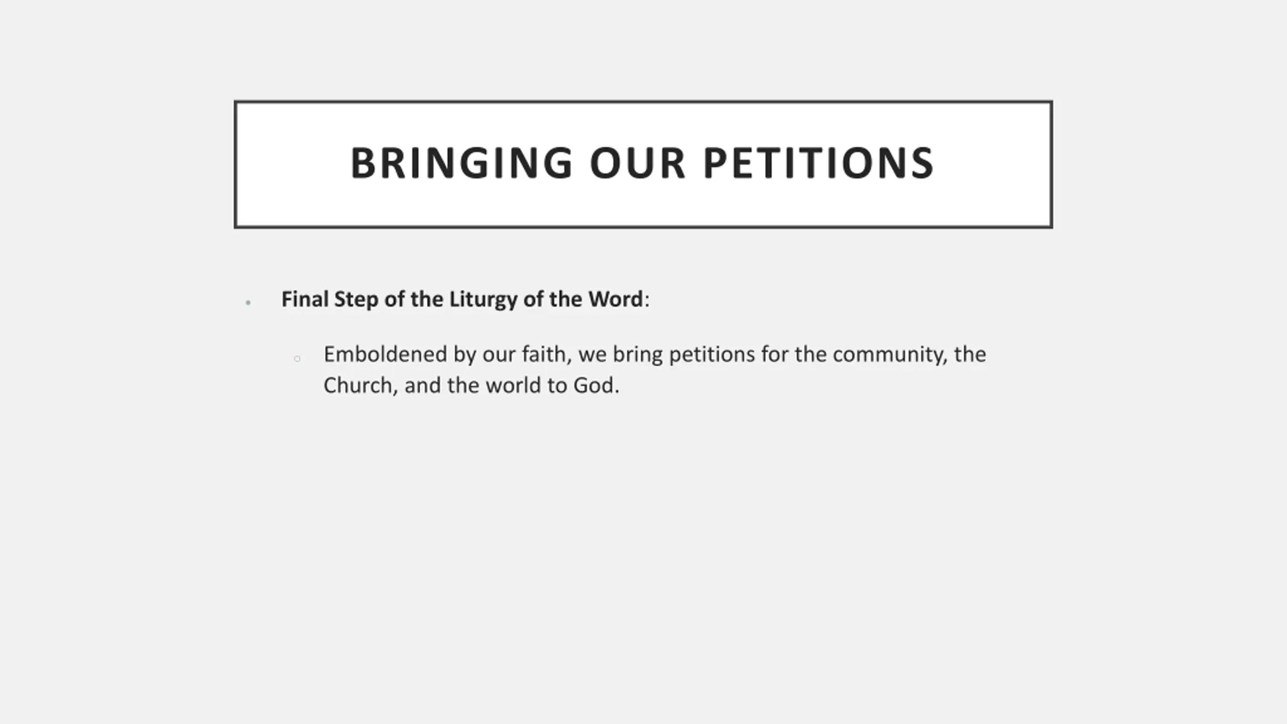 BRINGING OUR PETITIONS Final Step of the Liturgy of the Word: Emboldened by our faith, we bring petitions for the community, the Church, and the world to God. o