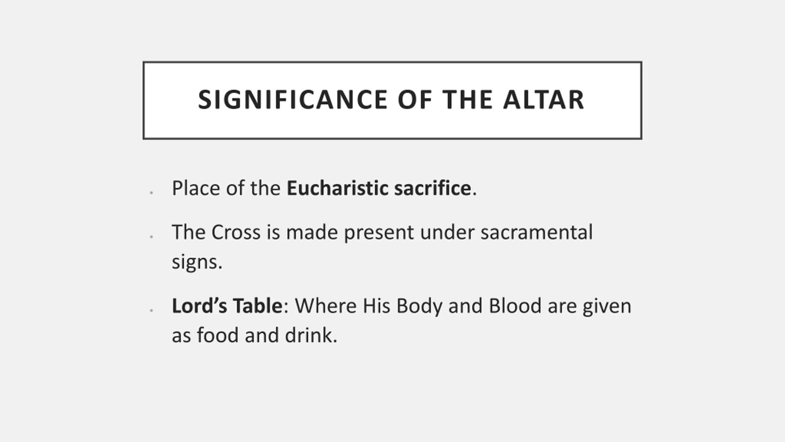 SIGNIFICANCE OF THE ALTAR Place of the Eucharistic sacrifice. The Cross is made present under sacramental signs. Lord s Table: Where His Body and Blood are given as food and drink.