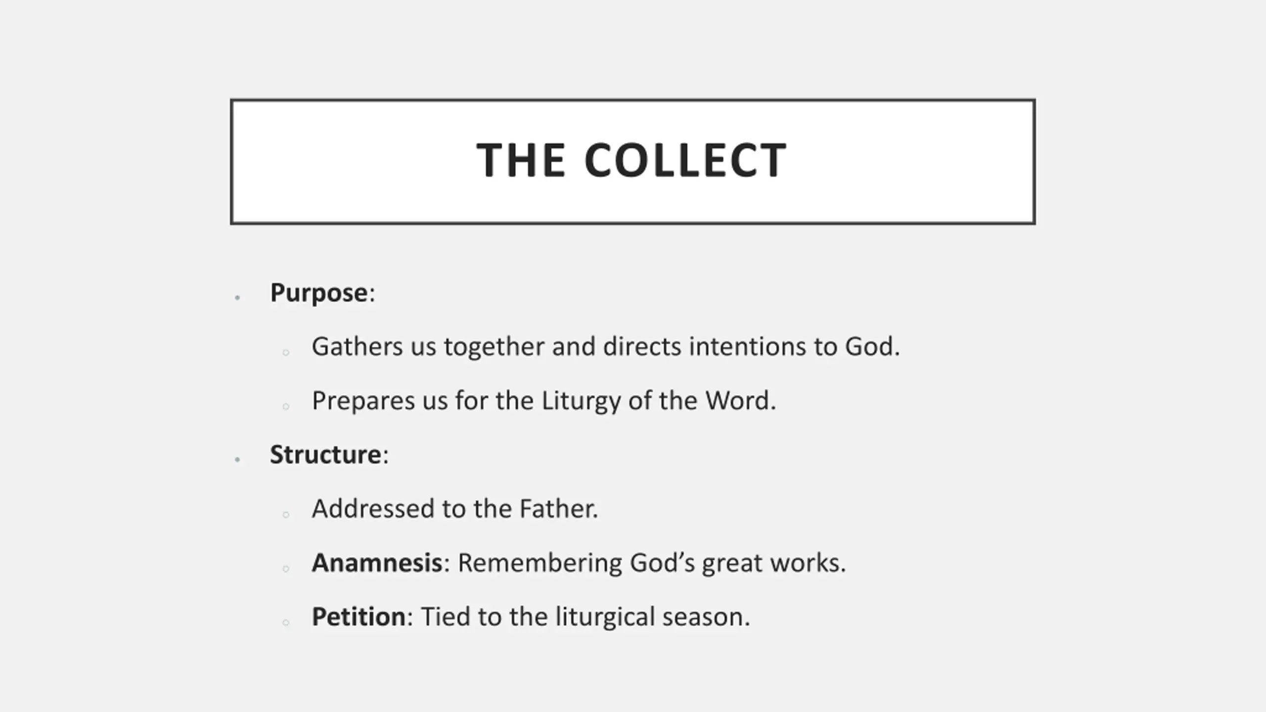 THE COLLECT Purpose: o Gathers us together and directs intentions to God. o Prepares us for the Liturgy of the Word. Structure: o Addressed to the Father. o Anamnesis: Remembering God s great works. o Petition: Tied to the liturgical season.