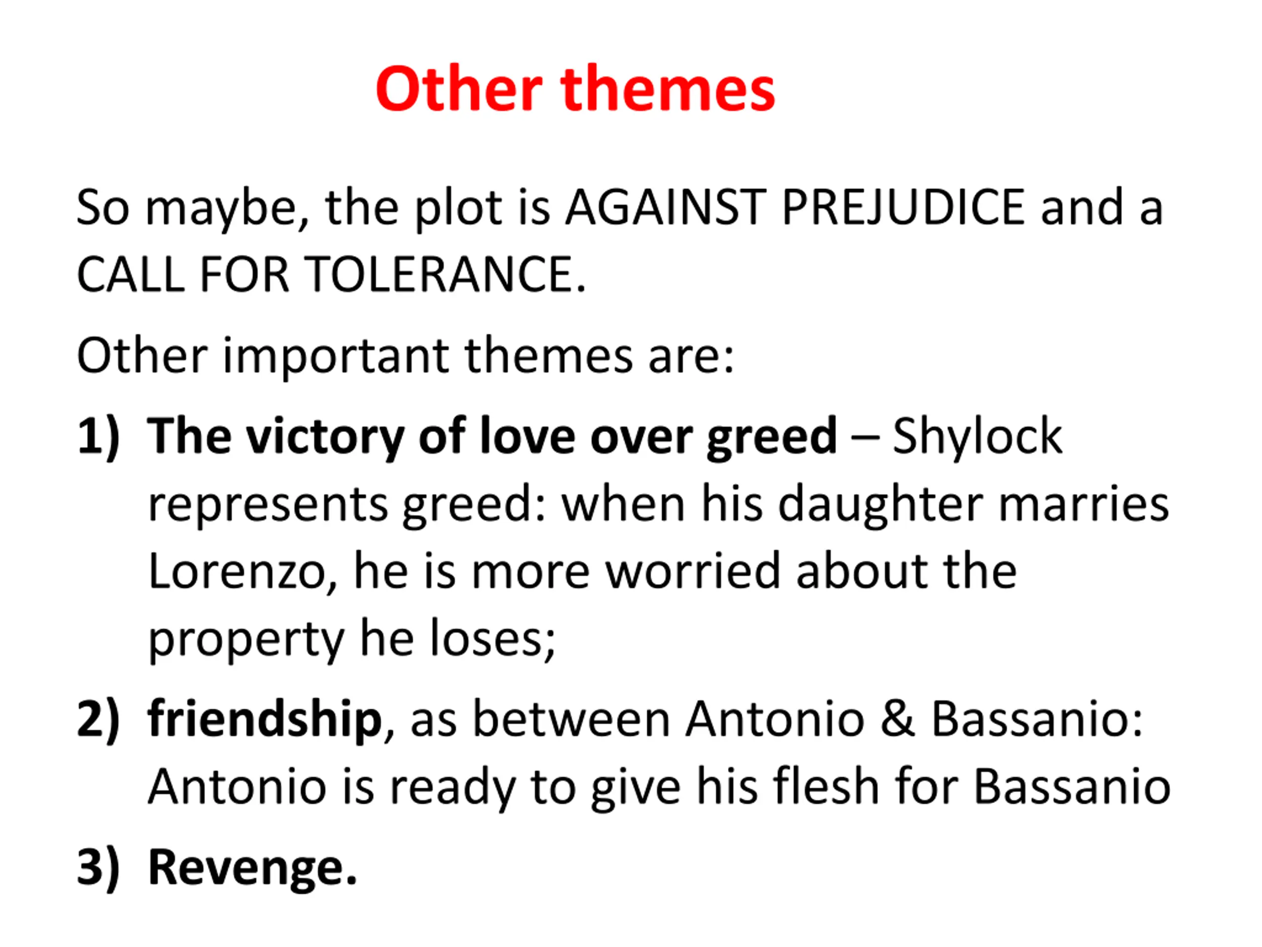 Other themes So maybe, the plot is AGAINST PREJUDICE and a CALL FOR TOLERANCE. Other important themes are: 1) The victory of love over greed Shylock represents greed: when his daughter marries Lorenzo, he is more worried about the property he loses; 2) friendship, as between Antonio & Bassanio: Antonio is ready to give his flesh for Bassanio 3) Revenge.
