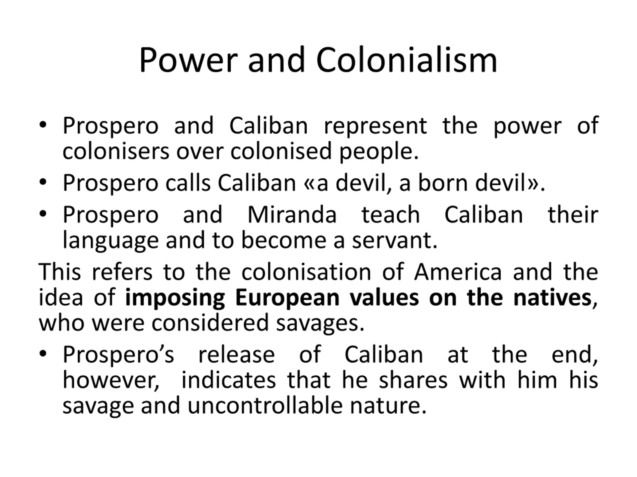Power and Colonialism Prospero and Caliban represent the power of colonisers over colonised people. Prospero calls Caliban a devil, a born devil . Prospero and Miranda teach Caliban their language and to become a servant. This refers to the colonisation of America and the idea of imposing European values on the natives, who were considered savages. Prospero s release of Caliban at the end, however, indicates that he shares with him his savage and uncontrollable nature.