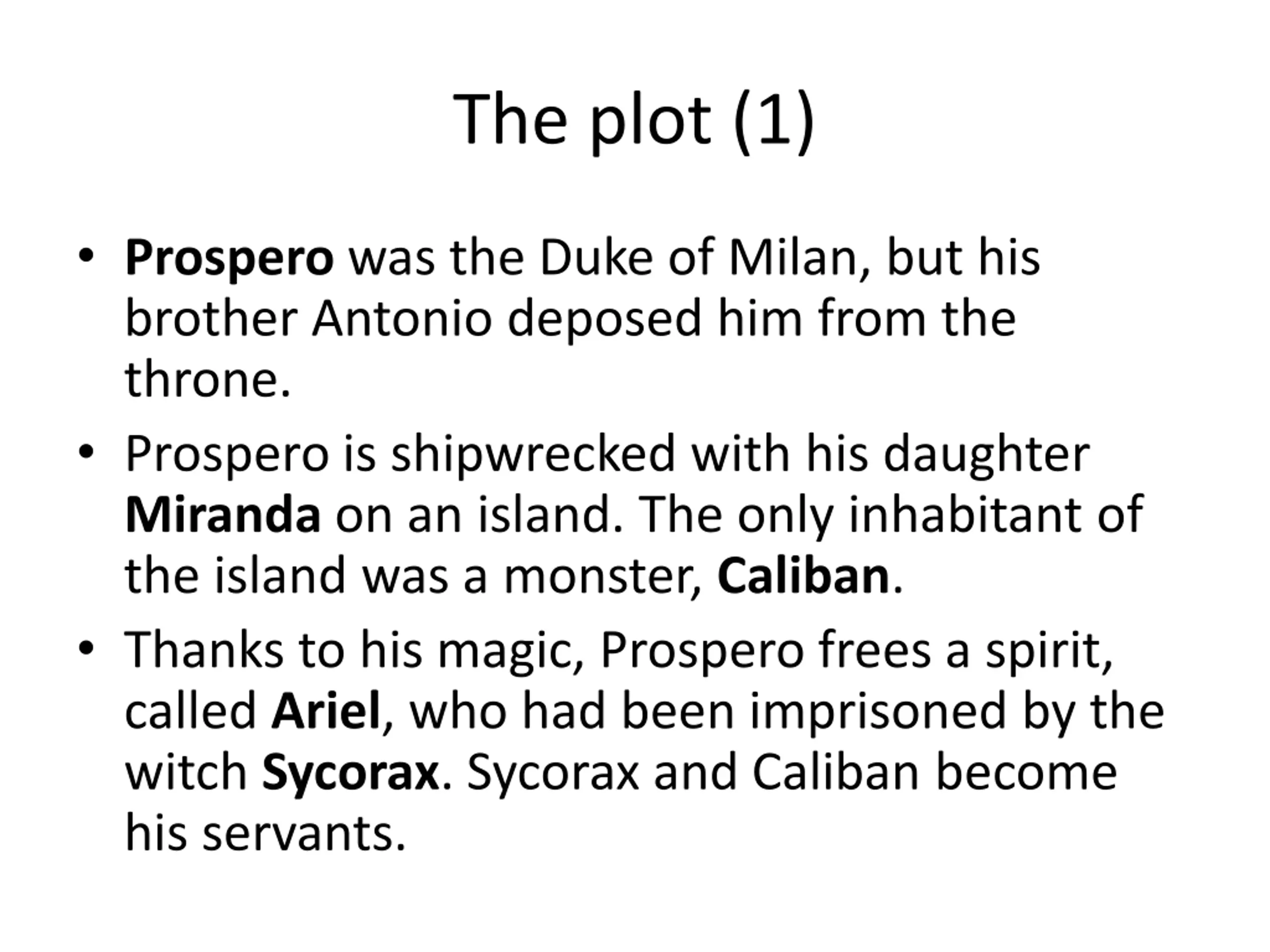 The plot (1) Prospero was the Duke of Milan, but his brother Antonio deposed him from the throne. Prospero is shipwrecked with his daughter Miranda on an island. The only inhabitant of the island was a monster, Caliban. Thanks to his magic, Prospero frees a spirit, called Ariel, who had been imprisoned by the witch Sycorax. Sycorax and Caliban become his servants.