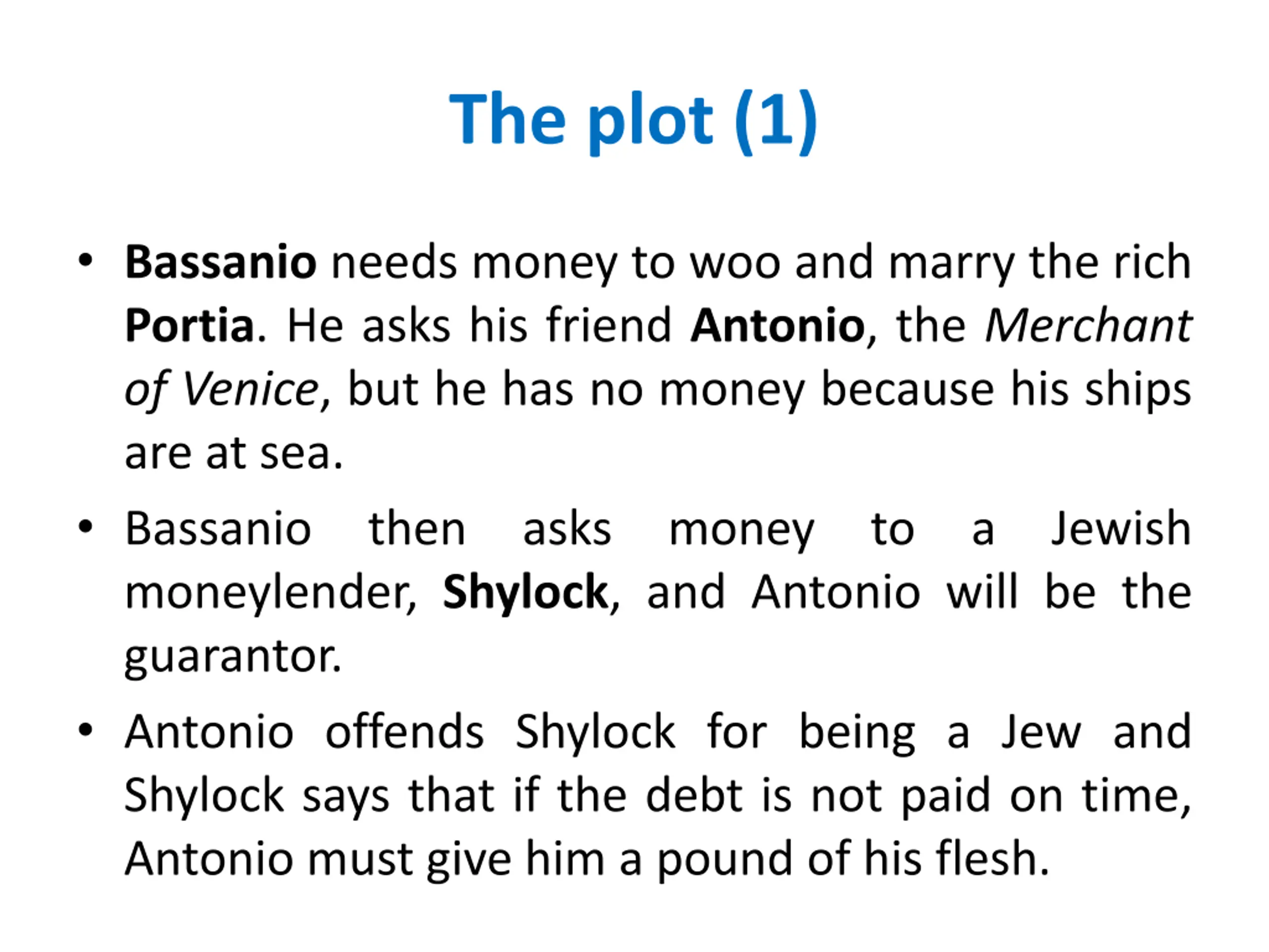 The plot (1) Bassanio needs money to woo and marry the rich Portia. He asks his friend Antonio, the Merchant of Venice, but he has no money because his ships are at sea. Bassanio then asks moneylender, Shylock, and Antonio will be the guarantor. Antonio offends Shylock for being a Jew and Shylock says that if the debt is not paid on time, Antonio must give him a pound of his flesh. money to a Jewish
