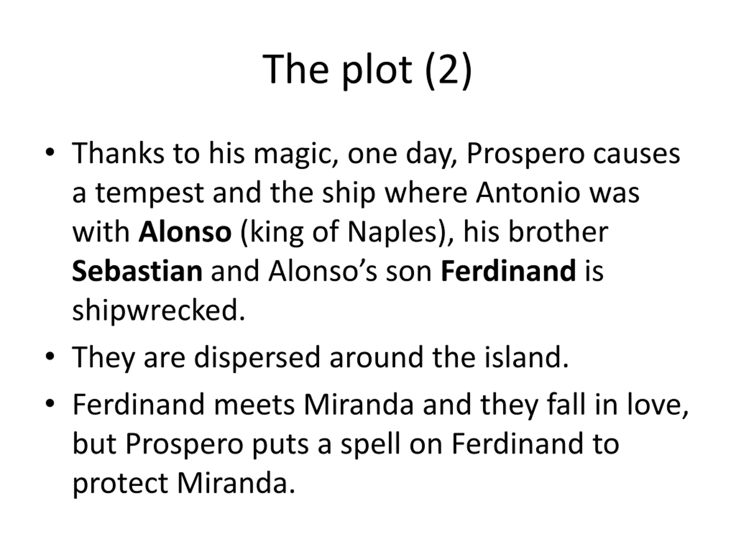 The plot (2) Thanks to his magic, one day, Prospero causes a tempest and the ship where Antonio was with Alonso (king of Naples), his brother Sebastian and Alonso s son Ferdinand is shipwrecked. They are dispersed around the island. Ferdinand meets Miranda and they fall in love, but Prospero puts a spell on Ferdinand to protect Miranda.