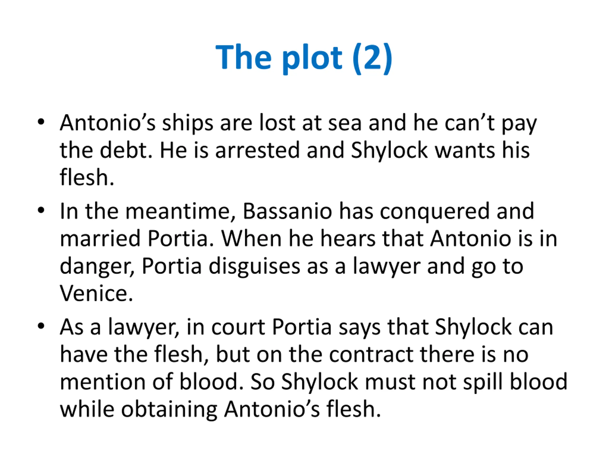 The plot (2) Antonio s ships are lost at sea and he can t pay the debt. He is arrested and Shylock wants his flesh. In the meantime, Bassanio has conquered and married Portia. When he hears that Antonio is in danger, Portia disguises as a lawyer and go to Venice. As a lawyer, in court Portia says that Shylock can have the flesh, but on the contract there is no mention of blood. So Shylock must not spill blood while obtaining Antonio s flesh.