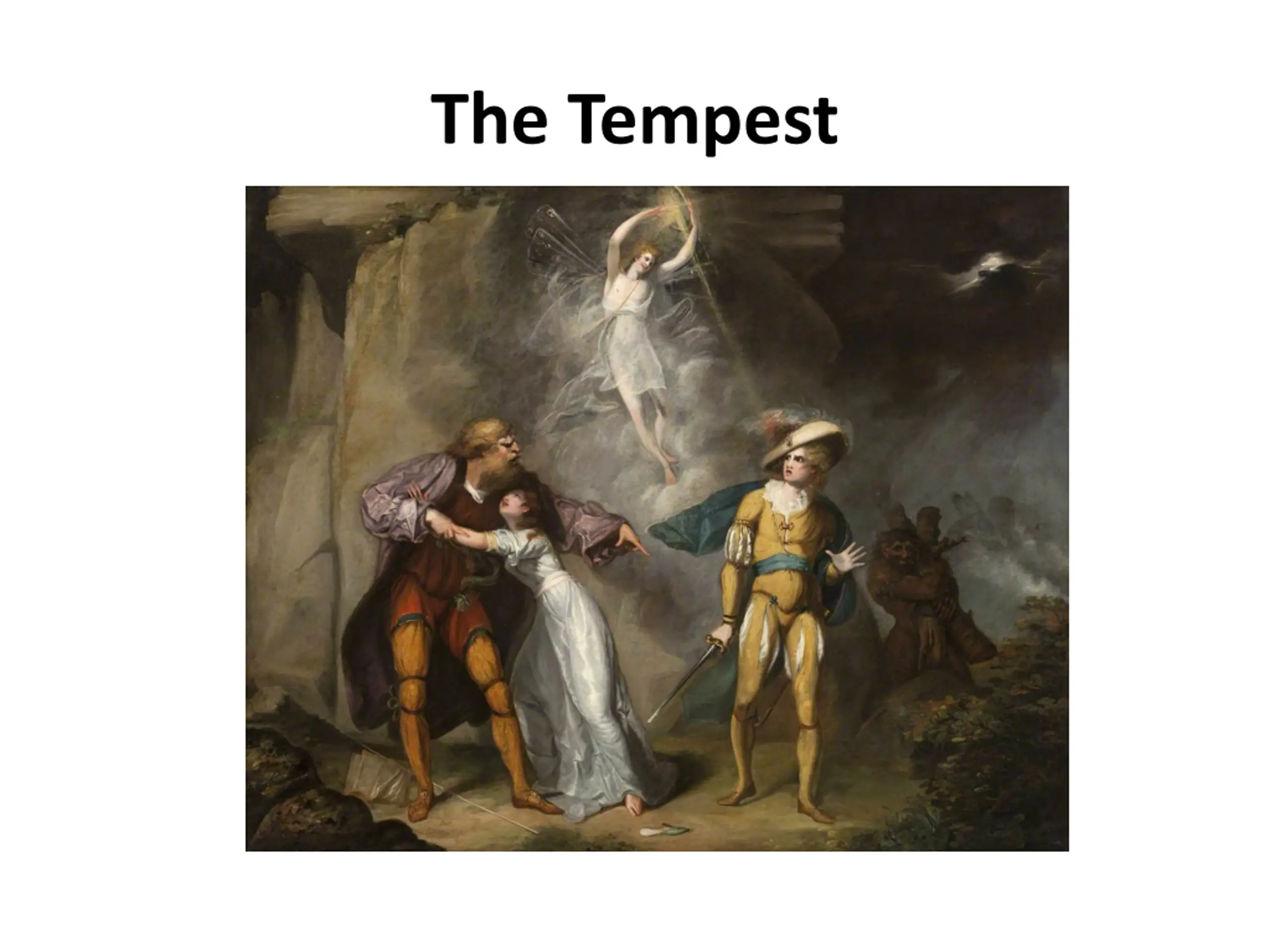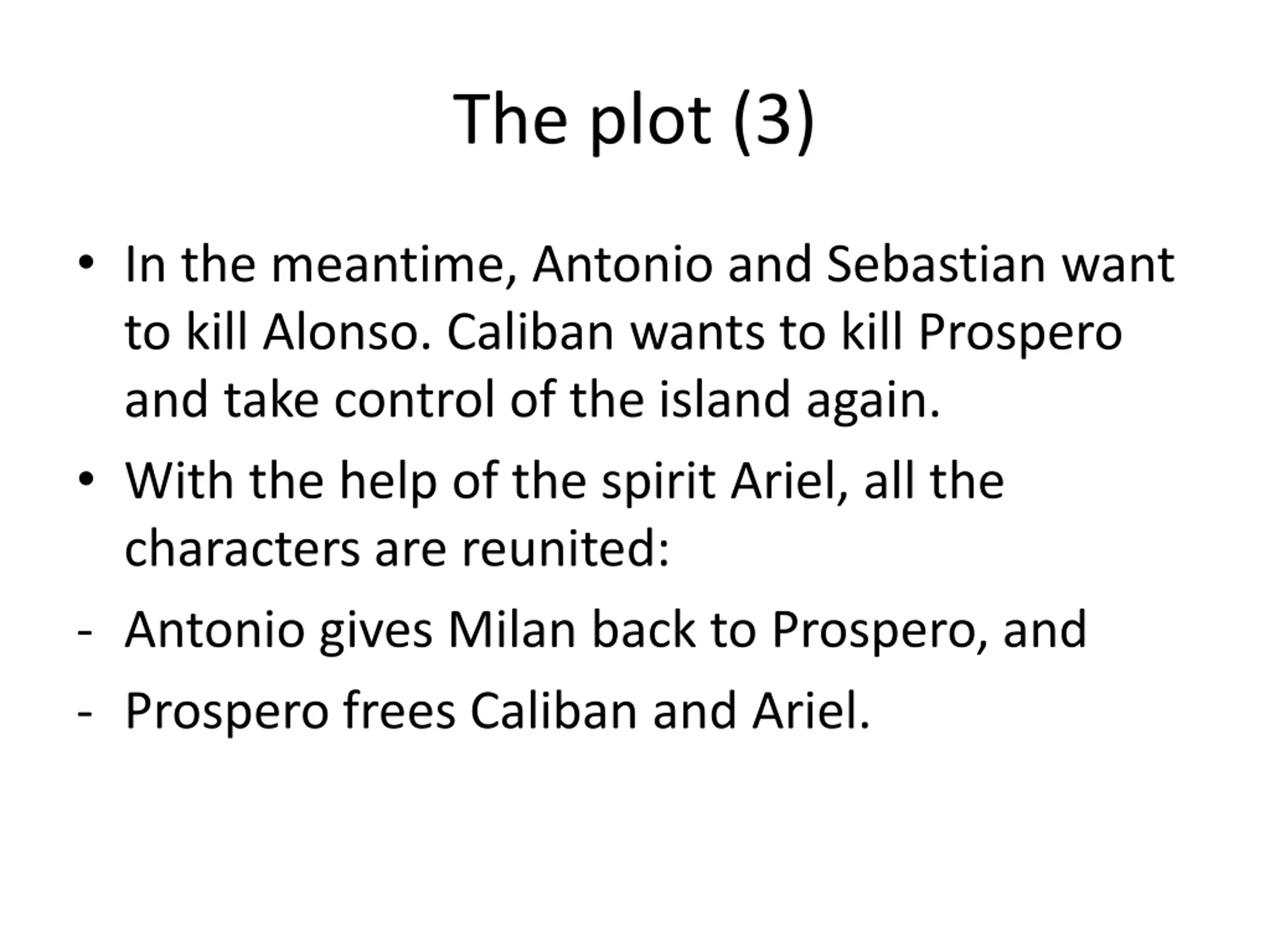 The plot (3) In the meantime, Antonio and Sebastian want to kill Alonso. Caliban wants to kill Prospero and take control of the island again. With the help of the spirit Ariel, all the characters are reunited: - Antonio gives Milan back to Prospero, and - Prospero frees Caliban and Ariel.
