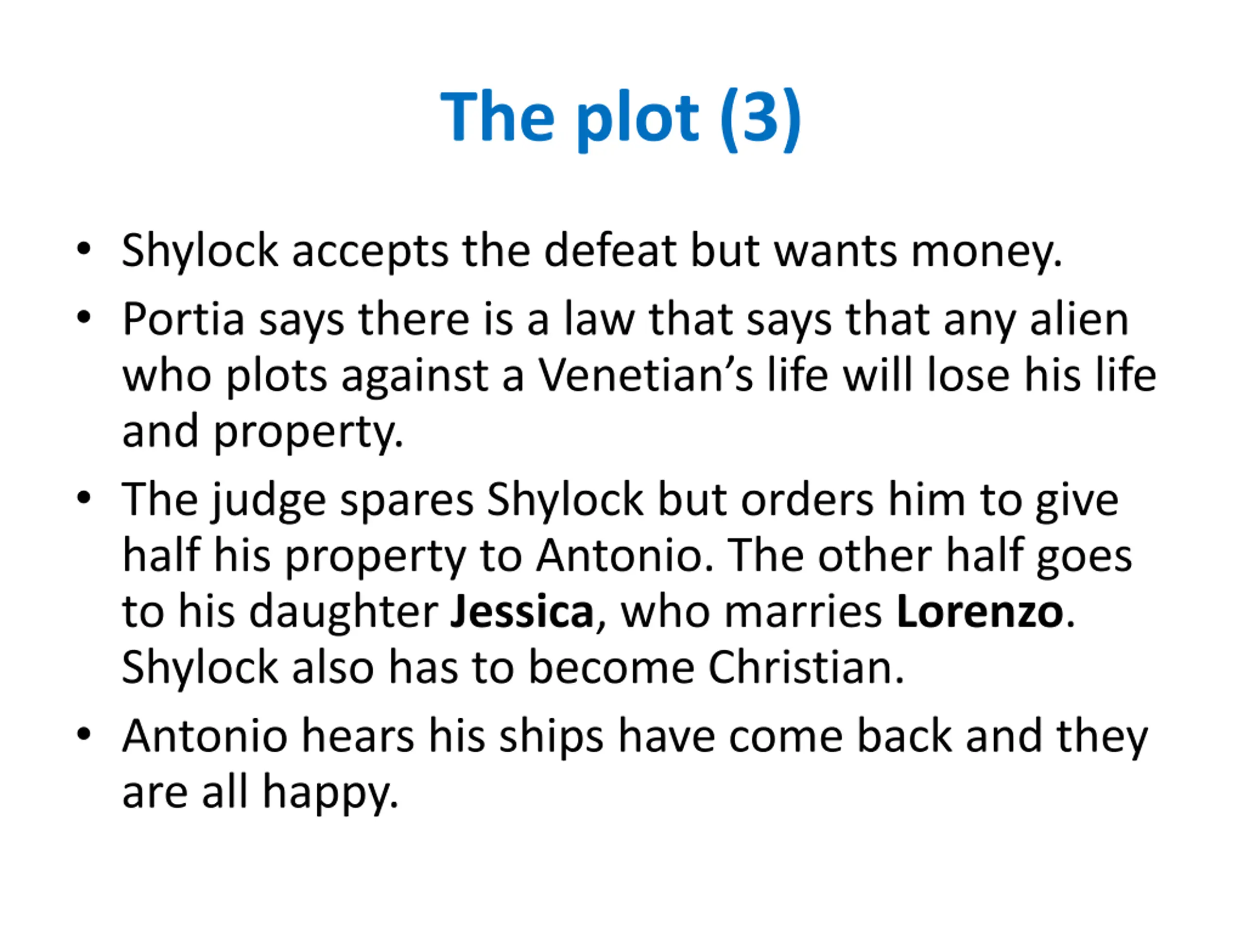 The plot (3) Shylock accepts the defeat but wants money. Portia says there is a law that says that any alien who plots against a Venetian s life will lose his life and property. The judge spares Shylock but orders him to give half his property to Antonio. The other half goes to his daughter Jessica, who marries Lorenzo. Shylock also has to become Christian. Antonio hears his ships have come back and they are all happy.
