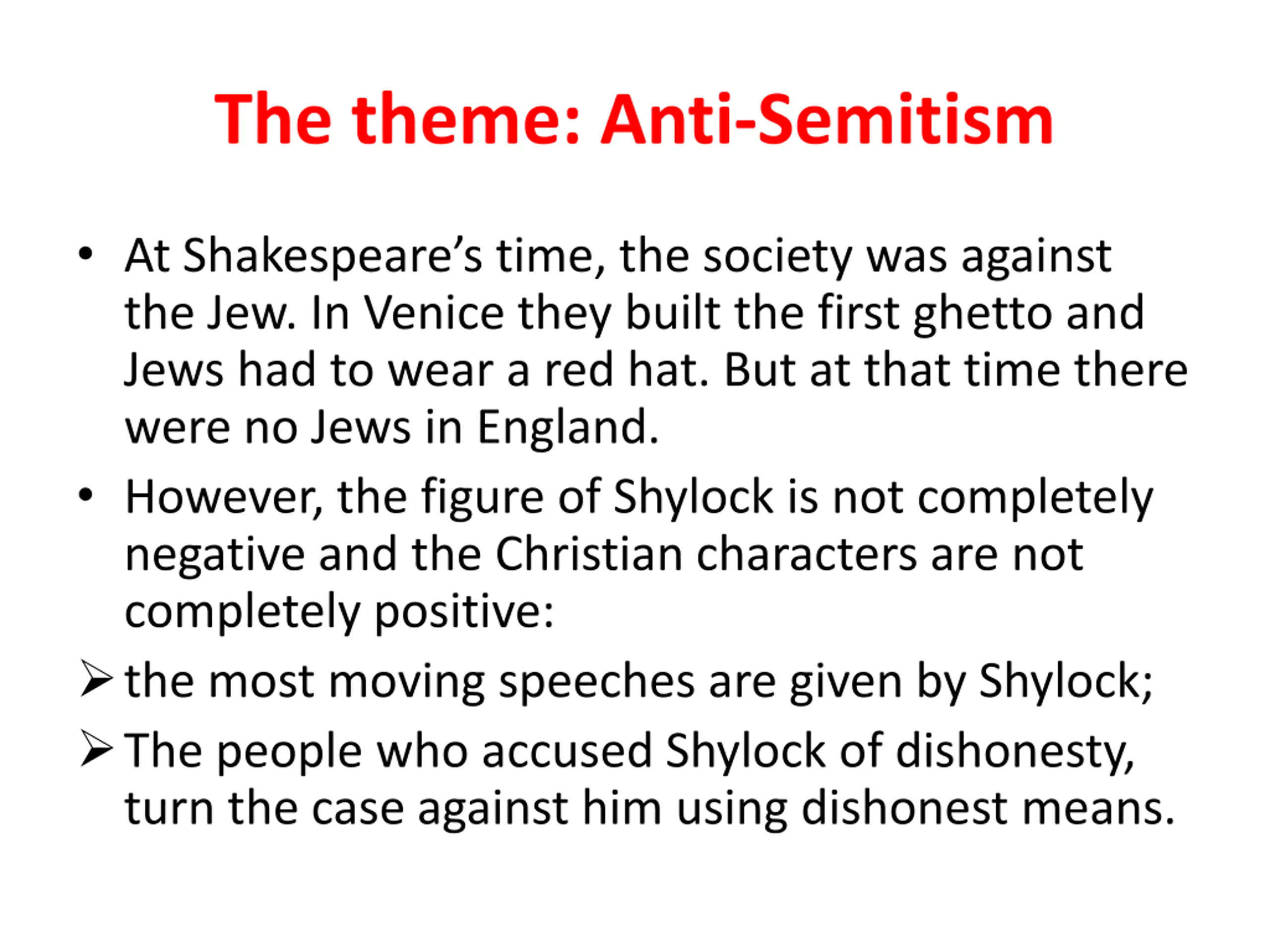 The theme: Anti-Semitism At Shakespeare s time, the society was against the Jew. In Venice they built the first ghetto and Jews had to wear a red hat. But at that time there were no Jews in England. However, the figure of Shylock is not completely negative and the Christian characters are not completely positive: the most moving speeches are given by Shylock; The people who accused Shylock of dishonesty, turn the case against him using dishonest means.