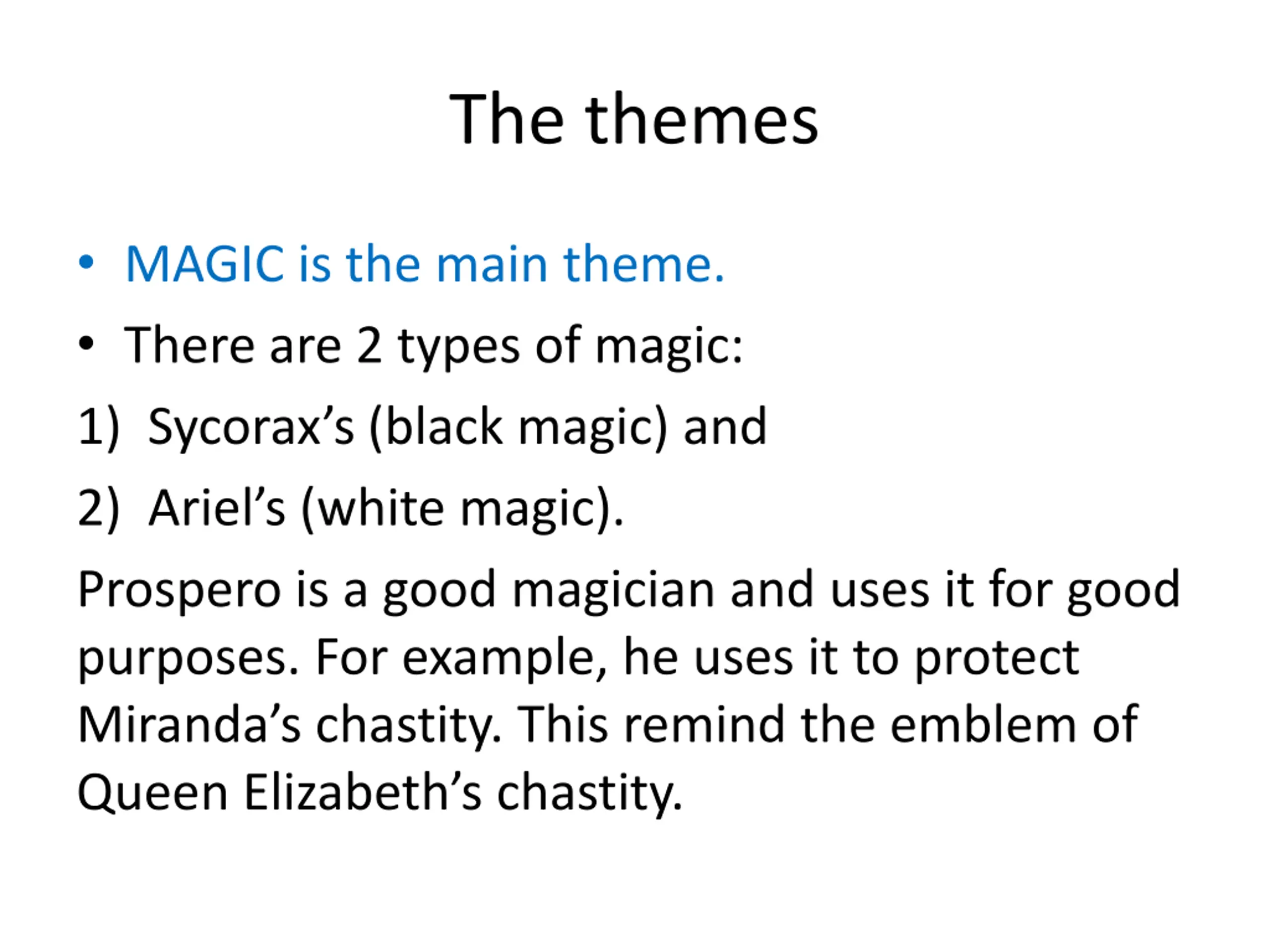 The themes MAGIC is the main theme. There are 2 types of magic: 1) Sycorax s (black magic) and 2) Ariel s (white magic). Prospero is a good magician and uses it for good purposes. For example, he uses it to protect Miranda s chastity. This remind the emblem of Queen Elizabeth s chastity.